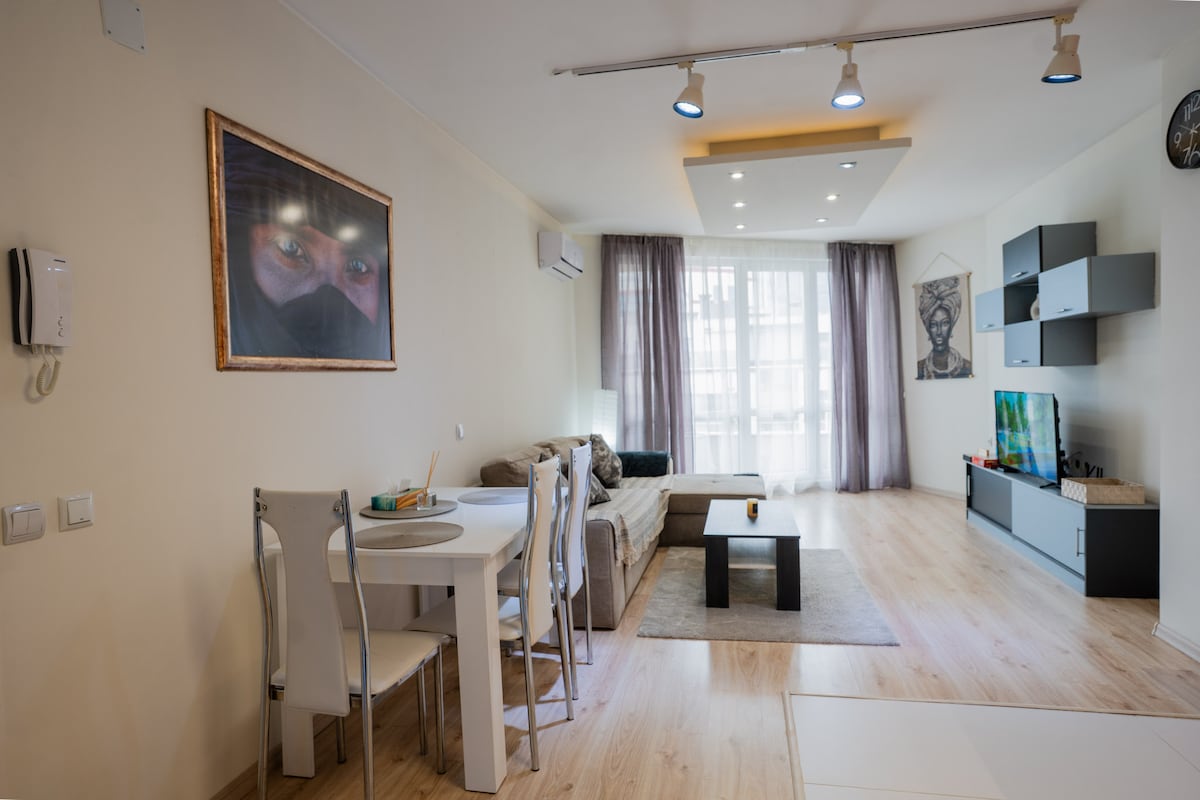 ¡Bienvenido! Nuestro departamento consta de cocina totalmente equipada con comedor, sala de estar, un dormitorio, una habitación con una cama doble, un baño y un balcón con una gran vista de la montaña Vitosha. El departamento está situado en un edificio con un hermoso patio trasero. Puedes aparcar en la calle. El apartamento está ubicado en una calle tranquila cerca de la Universidad Nueva Búlgara y una estación de metro.