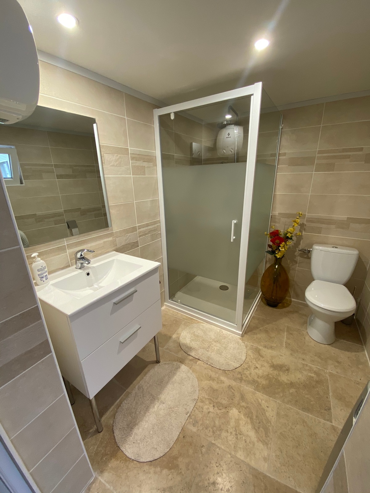 Logement 27m2, en Rez de jardin. Séjour avec 1 convertible 160 x 200cm et 1 chambre climatisée, avec un lit 160 x 200cms. Salle de bain, douche italienne, wc. Barbecue sur un jardin terrasse, le tout réservé exclusivement aux voyageurs. Le linge de lit est fourni: Draps, taies d'oreillers et couettes. Serviettes, Torchons. Gel douche . Et pour la cuisine: Sel, poivre, sucre, thé. Cafetière filtre + cafetière Tassimo. 2 cafetières.