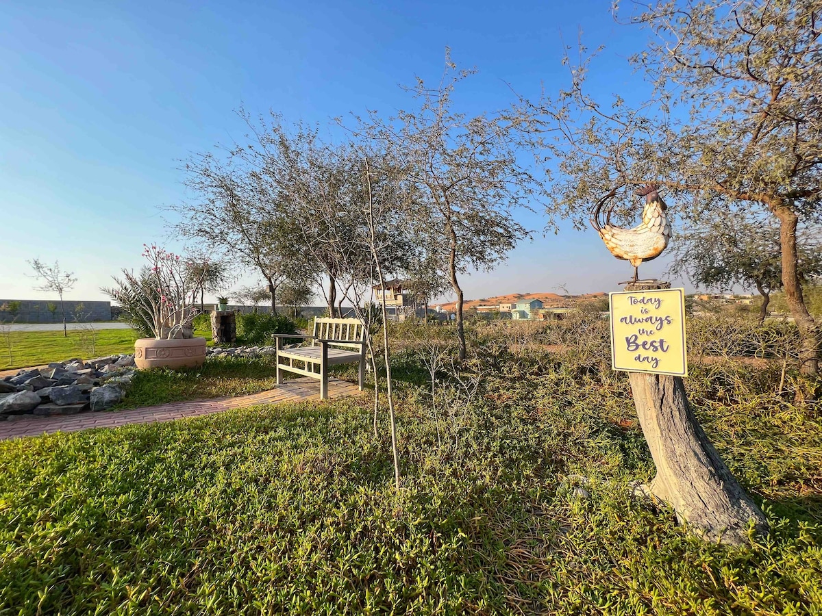 Disfruta de una estancia tranquila en una hermosa casa en una granja privada rodeada de árboles y espacios verdes con una piscina privada. El lugar es ideal para familias y aquellos que buscan relajarse lejos del ajetreo y el bullicio de la ciudad. La casa está totalmente equipada (3 cómodas habitaciones, cocina, asientos al aire libre, parrilla). Cerca de los servicios y las carreteras principales, está a poca distancia en auto de Dubai y ofrece una gran vista de la naturaleza. Una auténtica experiencia rural con lujo y confort en medio del desierto