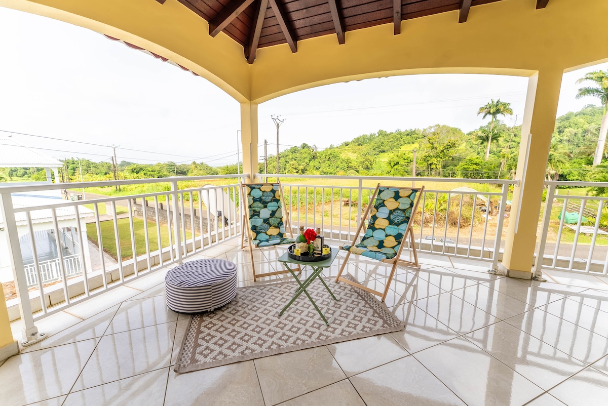 Nestled in a peaceful enclave within Guadeloupe National Park, the “Dancers of the Forest” house welcomes you into its lush green setting. The villa can accommodate up to 7 guests, with 3 air-conditioned bedrooms. As an option and subject to availability, the independent studio, “La loge des Danseuses”, provides 2 additional sleeping places. Amenities include a swimming pool with deck, a terrace with barbecue, high-speed internet, two fully equipped kitchens, a laundry room, and television