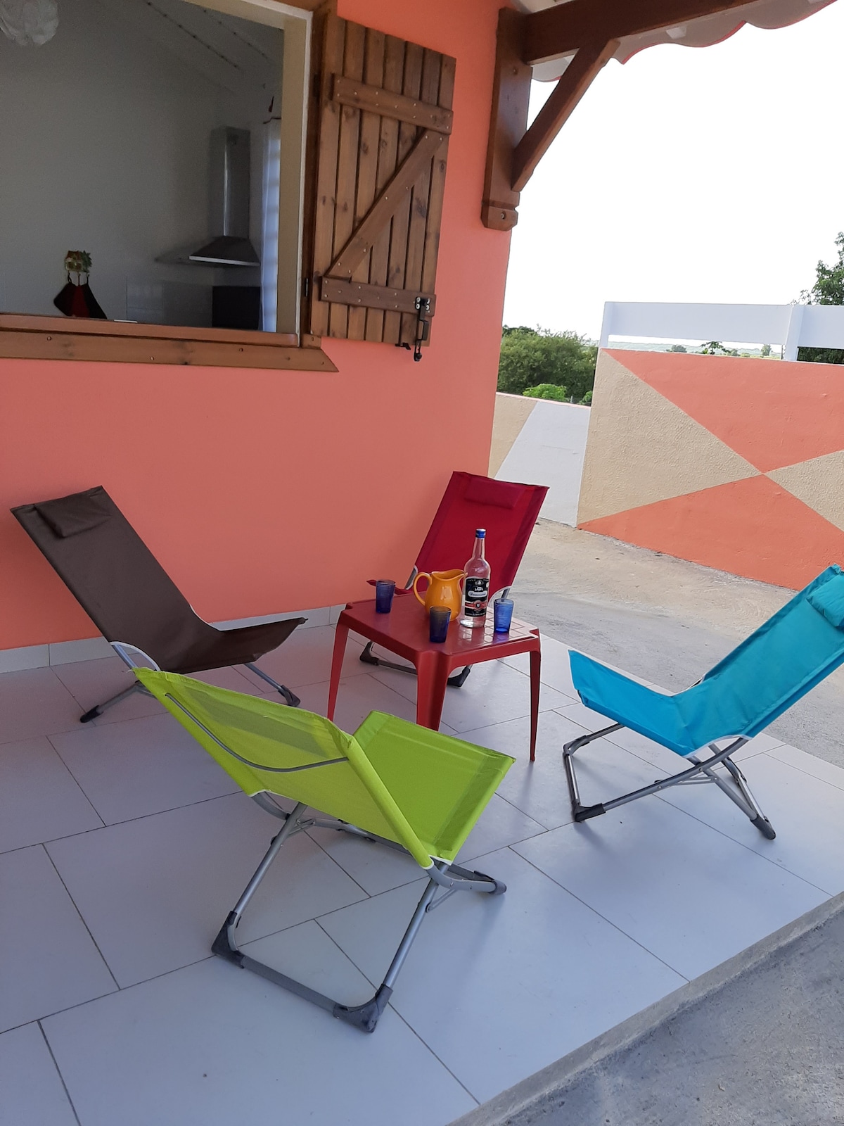 Maison colorée et lumineuse , parfaite pour un séjour dépaysant. Séjour-salle à manger jaune vif dynamique avec cuisine équipée ouverte (frigo, four, micro-ondes, plaques, vaisselle). Canapé convertible + TV. Deux chambres climatisées : une verte avec lit double confortable, une bleue , rangements et rideaux occultants. Salle de bain moderne : douche à l’italienne, WC , machine à laver. Grande terrasse couverte avec barbecue et coin salon extérieur. WiFi, clim. Proche plages (5-10min en voiture)