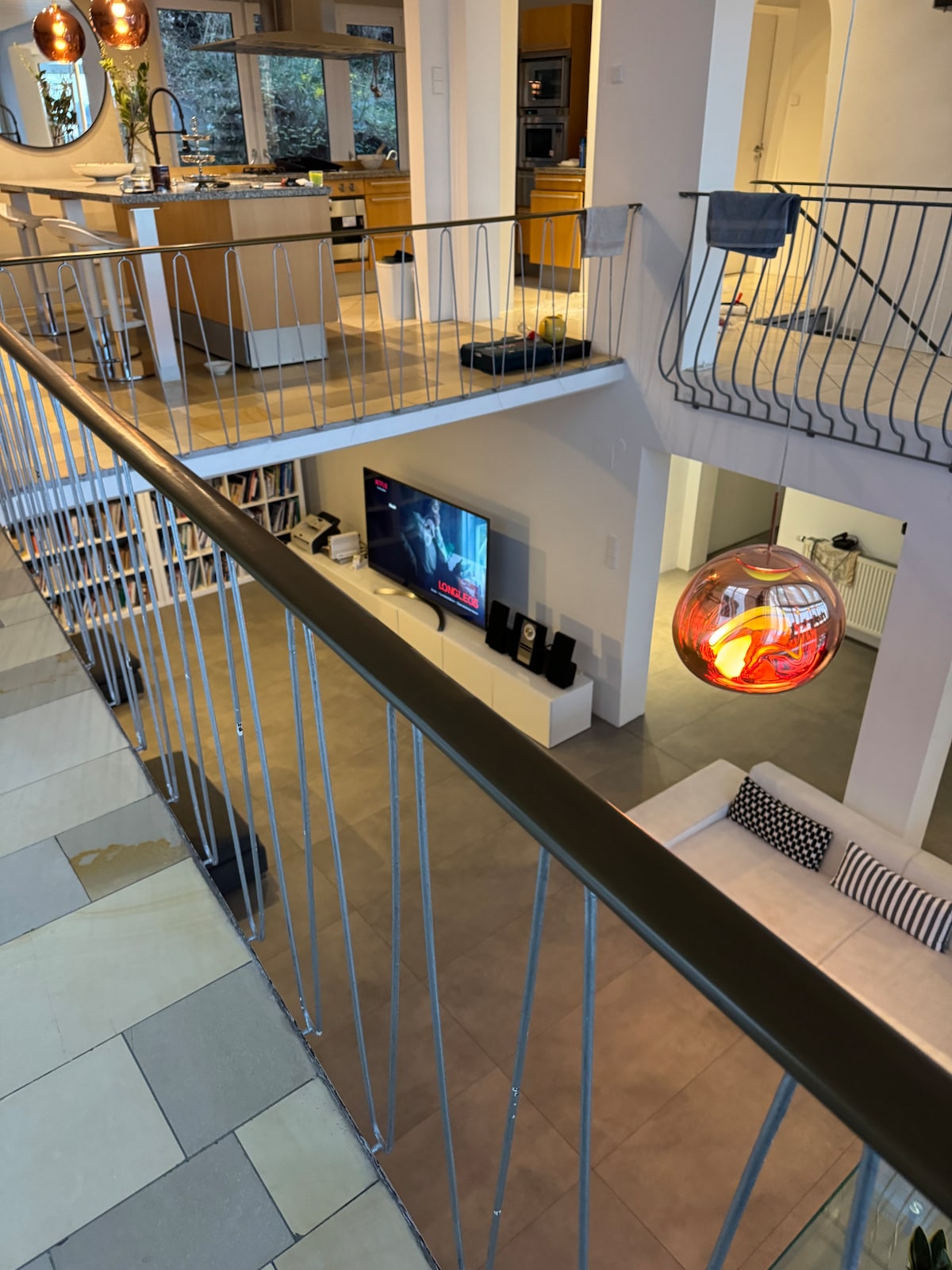Villa moderna en Stuttgart perfecta para grupos, reuniones, espaciosa, bien cuidada. Ofrece 300 m² de espacio habitable, 900 m², 3 habitaciones dobles con baño privado, 2 oficinas/habitaciones, 2 salas de estar, 1 aseo, una gran sala de conferencias con vistas de ensueño y 12 sillas - sauna pequeña - Cochera Sala de estar con chimenea abierta, galería en 2 plantas Stuttgart-Vaihingen ofrece una excelente infraestructura. Universidad de Stuttgart a 10 minutos -15 minutos al centro de la ciudad en autobús, tren - Compras, recreación forestal cerca.