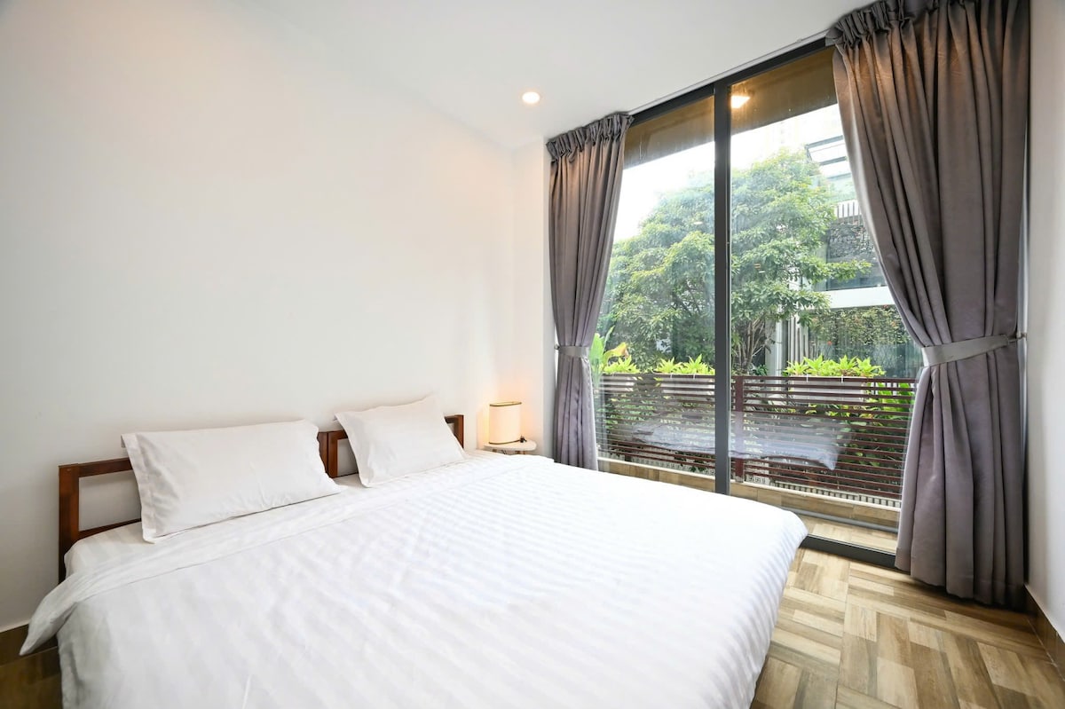 Amplio departamento entero de 1 dormitorio. Tranquila vista de la vegetación del barrio de Thao Dien. 1 cama tamaño queen con aire acondicionado. Sillón cómodo. Ventanas luminosas del techo al suelo. Ducha caliente. Cocina totalmente equipada. Lavadora. TV inteligente con Youtube, Netflix y canales de cable mejorados. Wifi de alta velocidad. Muy tranquilo, luminoso y espacioso, seguridad 24/7, ubicado en el Distrito 2, a solo 15-20 minutos en auto del Distrito 1 (centro de la ciudad) Fácil acceso a cafeterías, restaurantes, tiendas y supermercados cercanos