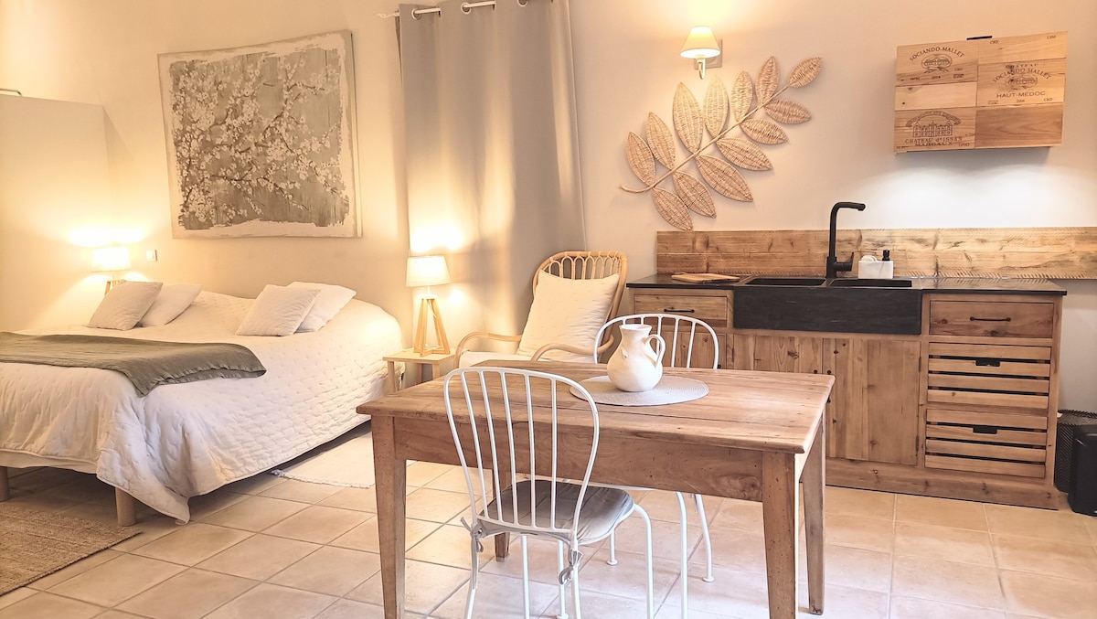 Casa privada sin vecinos, un verdadero remanso de paz, perfecta para una escapada o una estancia relajante. A pocos minutos a pie del centro de la ciudad, combina comodidad y refinamiento. Disfrute de un jardín privado con jacuzzi, una acogedora sala de estar con TV, internet de alta velocidad y aire acondicionado, así como un sillón de masaje tántrico. Habitación con cama king size, cuarto de baño moderno. Desayuno incluido, bodega, «tabla de aperitivos» y peticiones especiales bajo petición para satisfacerle.