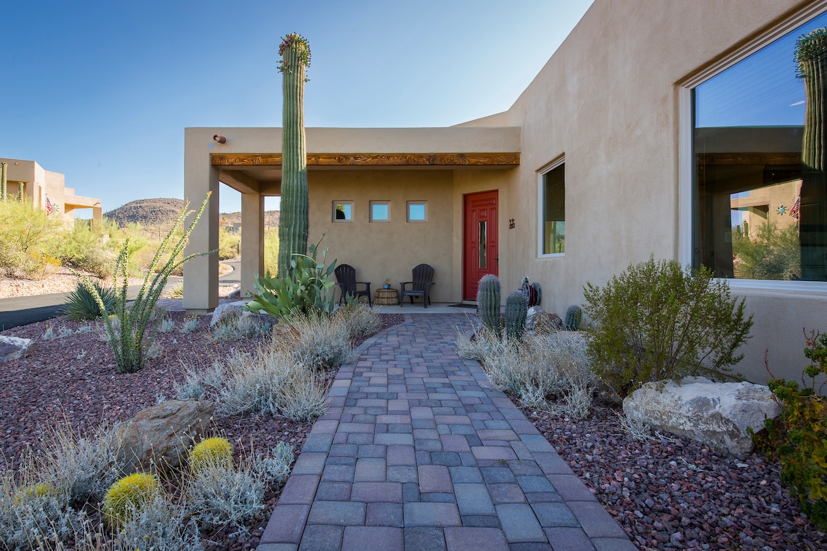 Spacious, sun-filled home on side of butte surrounded by a gorgeous 3.2 acres of lush Sonoran desert. Step out onto a private patio to drink coffee in the mornings or dine in the evenings, and have your senses awakened to the sights and sounds of desert interest and beauty. The whole property is yours to explore and enjoy, with a private walking path where you can hike to the heights for a hundred-mile view. The home sits on high ground and large windows offer 360 degree views. Be inspired!