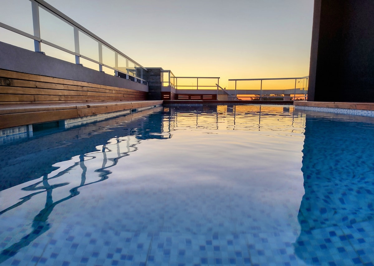 New and modern apartment with an incredible ocean view. One block from the sea and the heart of Pinamar downtown. The complex has an outdoor pool, heated indoor pool, gym, yacuzzi, sauna, cinema room, table tennis. You can also enjoy a private yacuzzi overlooking the sea. There is a laundry in the building.