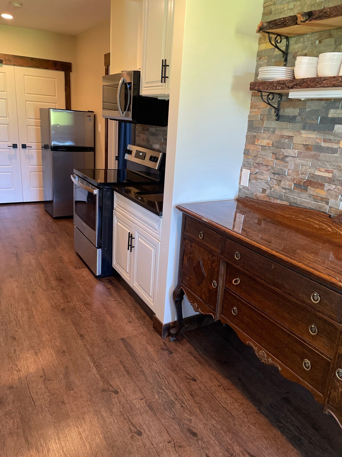 Rodeada de recreación y belleza de montaña, disfruta de nuestra suite de invitados con entrada privada, dormitorio, cómoda sala de estar y baño. Relájate junto a tu acogedora chimenea rodeada de una gran colección de equipos y accesorios antiguos de esquí alpino. Tu terraza privada y cubierta tiene un telesilla antiguo. Wifi, nevera, microondas, TV con Netflix, cafetera y refrescos de cortesía se suman a tu comodidad. Ten en cuenta que, en invierno, se requiere AWD/4WD para conducir de forma segura por nuestro carril.