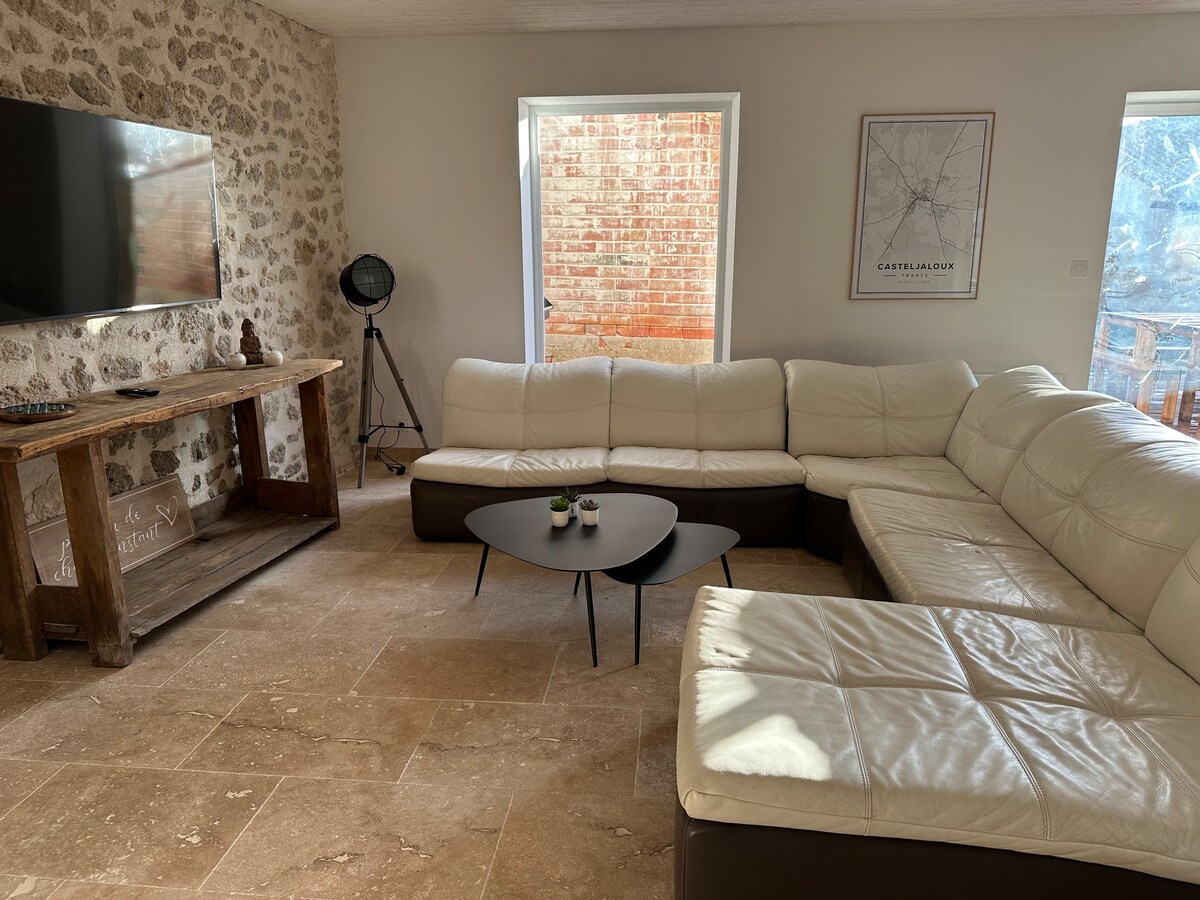 Situada en el corazón de una bastida, una antigua casa de piedra, totalmente renovada, luminosa y confortable. con jardín cerrado, piscina privada y terraza cubierta. Lugar ideal para pasar un fin de semana o unas vacaciones tranquilas, en el corazón del suroeste en familia o con amigos. A 1 hora de Burdeos, 1 hora 20 minutos de Toulouse y a 10 minutos de la autopista A62. Cerca del bosque de las Landas, de Casteljaloux y sus termas, su casino, su lago y su campo de golf, Nérac y su castillo, sus paseos en barco