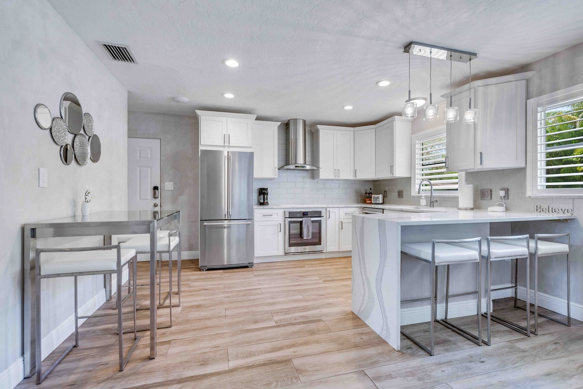 A las afueras del centro de la ciudad, cerca del sendero Legacy Trail, esta casa se encuentra en un barrio tranquilo a solo 15 minutos de la playa Siesta Key. La casa destaca por su diseño luminoso y espacioso, su nueva piscina de agua salada en el patio trasero privado y su sala de estar ventilada. La gran ducha de efecto lluvia del baño principal es perfecta para lavar la arena sobrante de la playa. También puedes pasar tus noches haciendo barbacoas en la parte trasera o jugando al «corn hole» en la zona del patio.