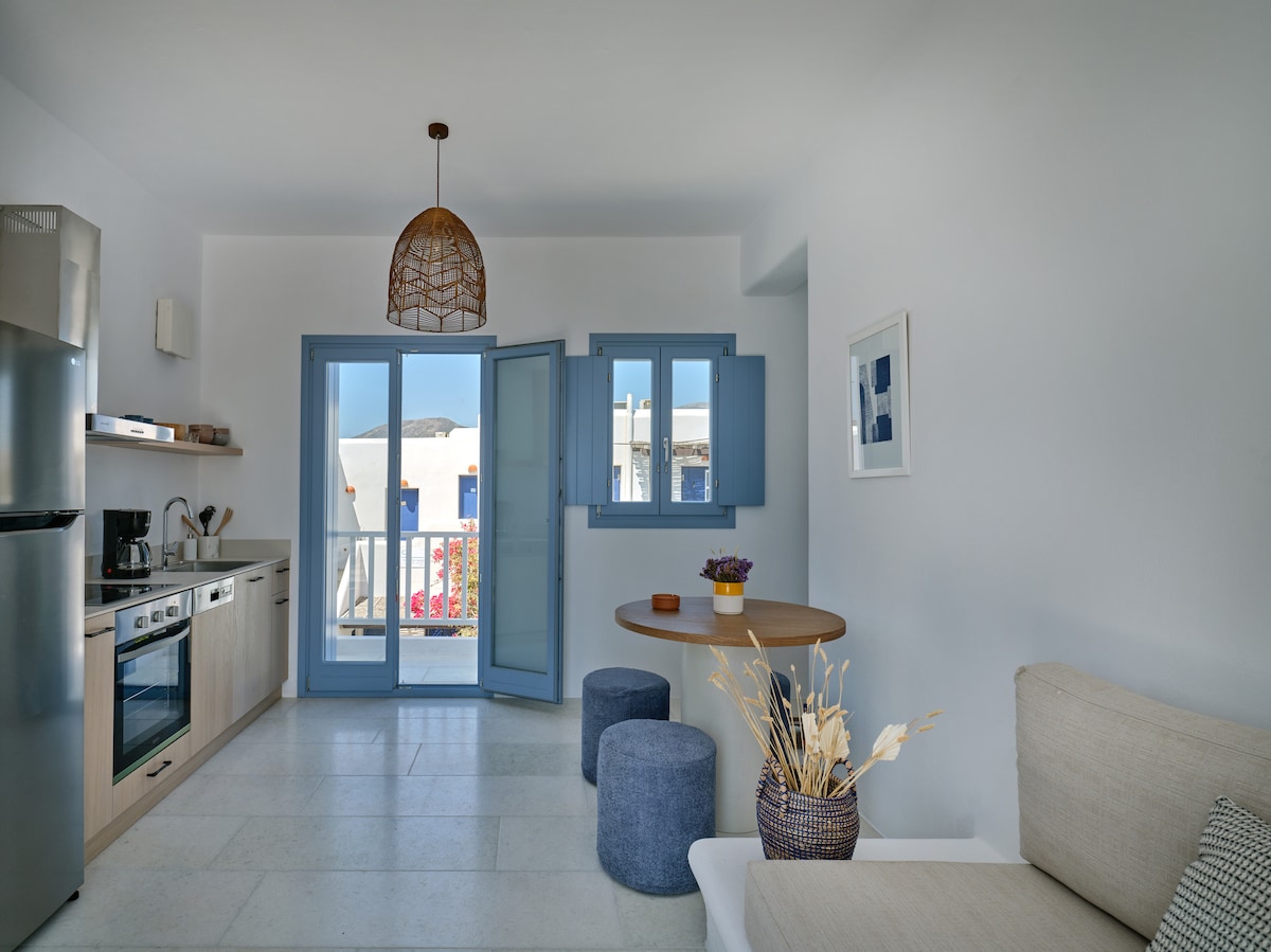 Nuestro punto de referencia es el mar, el aura que emana el lugar y la luz cicládica. Etherio se encuentra en una colina, de ahí su característico nombre. Desde nuestros apartamentos disfrutarás de las vistas al pueblo de Piso Livadi, a la pequeña iglesia tradicional de Agios Nikolaos y a los mágicos reflejos de color del horizonte marítimo que se extiende hasta la isla de Naxos, una auténtica «ventana al Egeo». Nadie puede resistirse a la vista de las Cícladas con las alteraciones de la luz desde el amanecer hasta el atardecer.