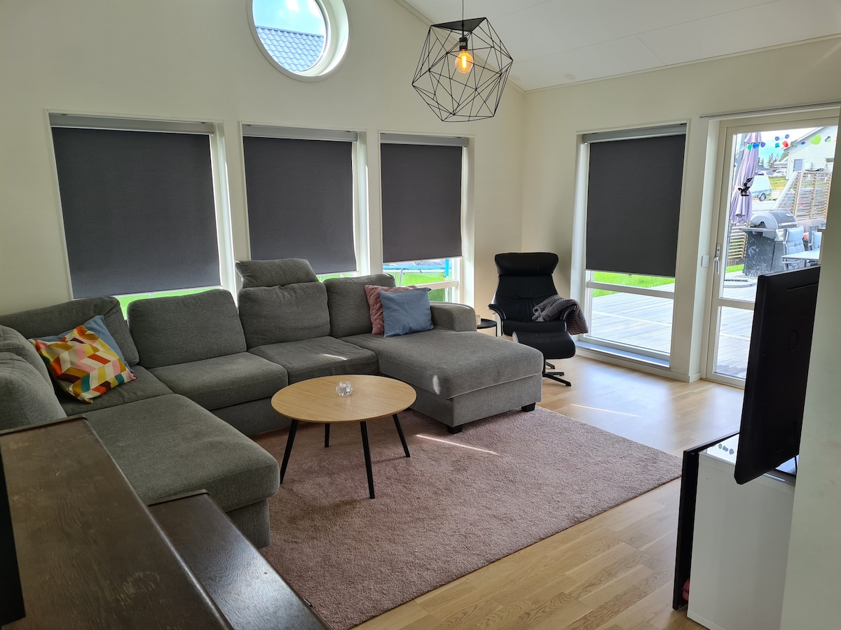 Encantadora casa con una sala abierta y amplia que es perfecta para relajarse, trabajar o para la familia. La casa está en una zona muy tranquila, muy cerca de una tienda de comestibles, Una gran sala con una chimenea interior y una gran pantalla de TV, Netflix gratuito, HBO, Disney y, por supuesto, muchas otras aplicaciones en TV inteligente. La cocina está totalmente equipada con estufa nueva, lavavajillas y todo el equipo que necesitas. Tres dormitorios, dos con camas tamaño king. Una amplia terraza y barbacoa. Un auto de alquiler puede estar disponible.