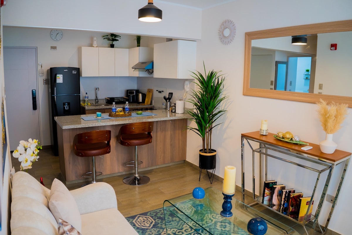 🏡 Relájate en un espacio moderno, funcional y cuidadosamente equipado en el corazón de Piura. Este apartamento minimalista es perfecto para 4 huéspedes, con 2 habitaciones acogedoras, una estudio y una distribución pensada para tu comodidad. Ideal para viajes de trabajo, escapadas en pareja, vacaciones en familia o visitas. Disfruta de una zona de trabajo, llegada autónoma, cochera privada y una cocina completa con diseño elegante. ☕️ ¡Comodidad, estilo y privacidad, todo en un solo lugar!