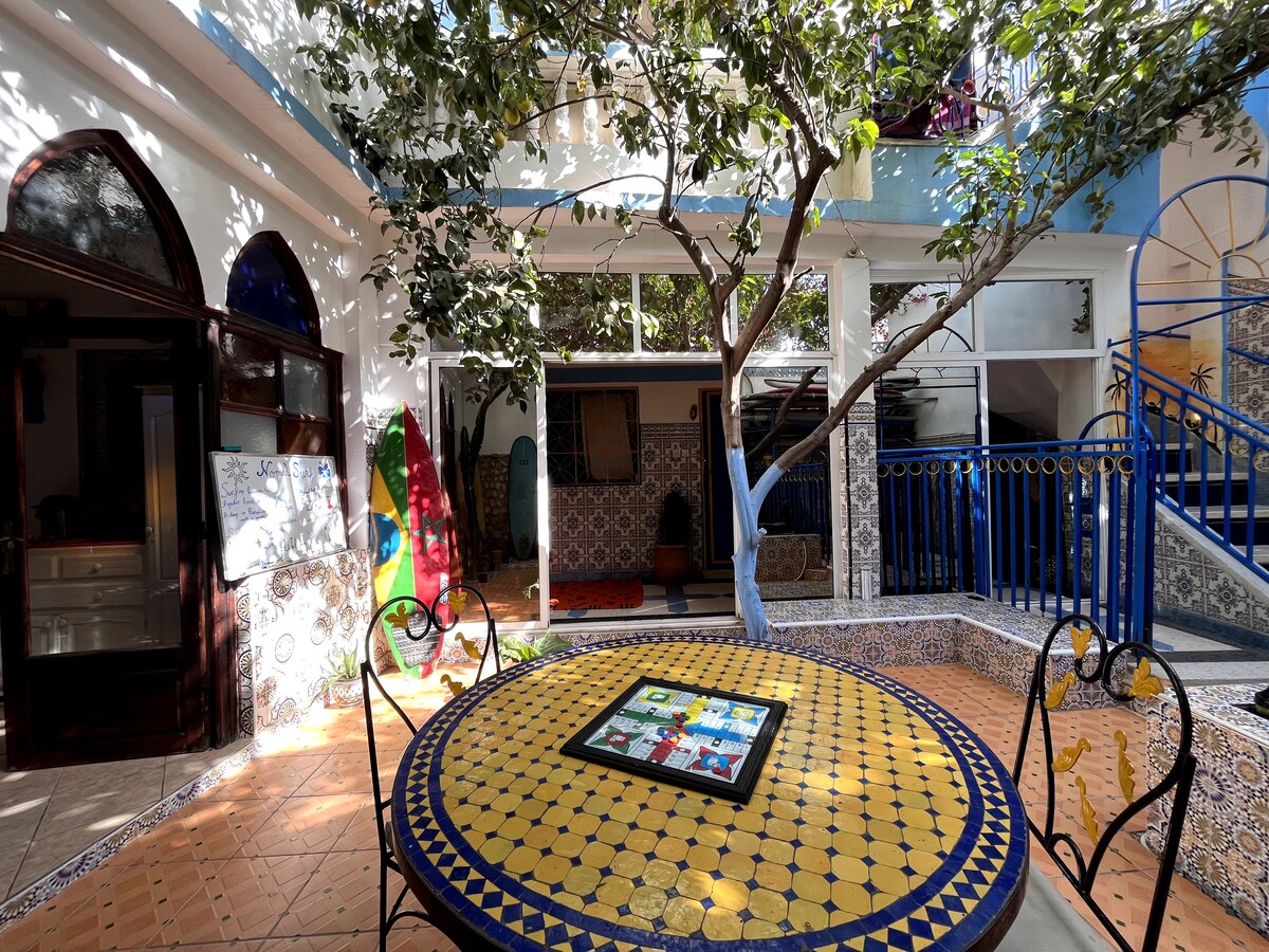 En una humilde calle encaramada en la encantadora ciudad de surf de Tamraght, encontrarás nuestra casa. Nuestras habitaciones son luminosas y ventiladas, con cada detalle cuidadosamente seleccionado y amorosamente organizado. Desde nuestras espaciosas azoteas, tienes una amplia vista del mar, de toda la encantadora ciudad y de las montañas. Un panorama completo de 360 grados. Perfecto para practicar yoga, ver las olas y descansar. A 5-10 minutos a pie de tiendas, restaurantes y a 15 minutos de la playa. Podemos preparar comidas y organizar experiencias. DESAYUNO (con vistas) INCLUIDO.