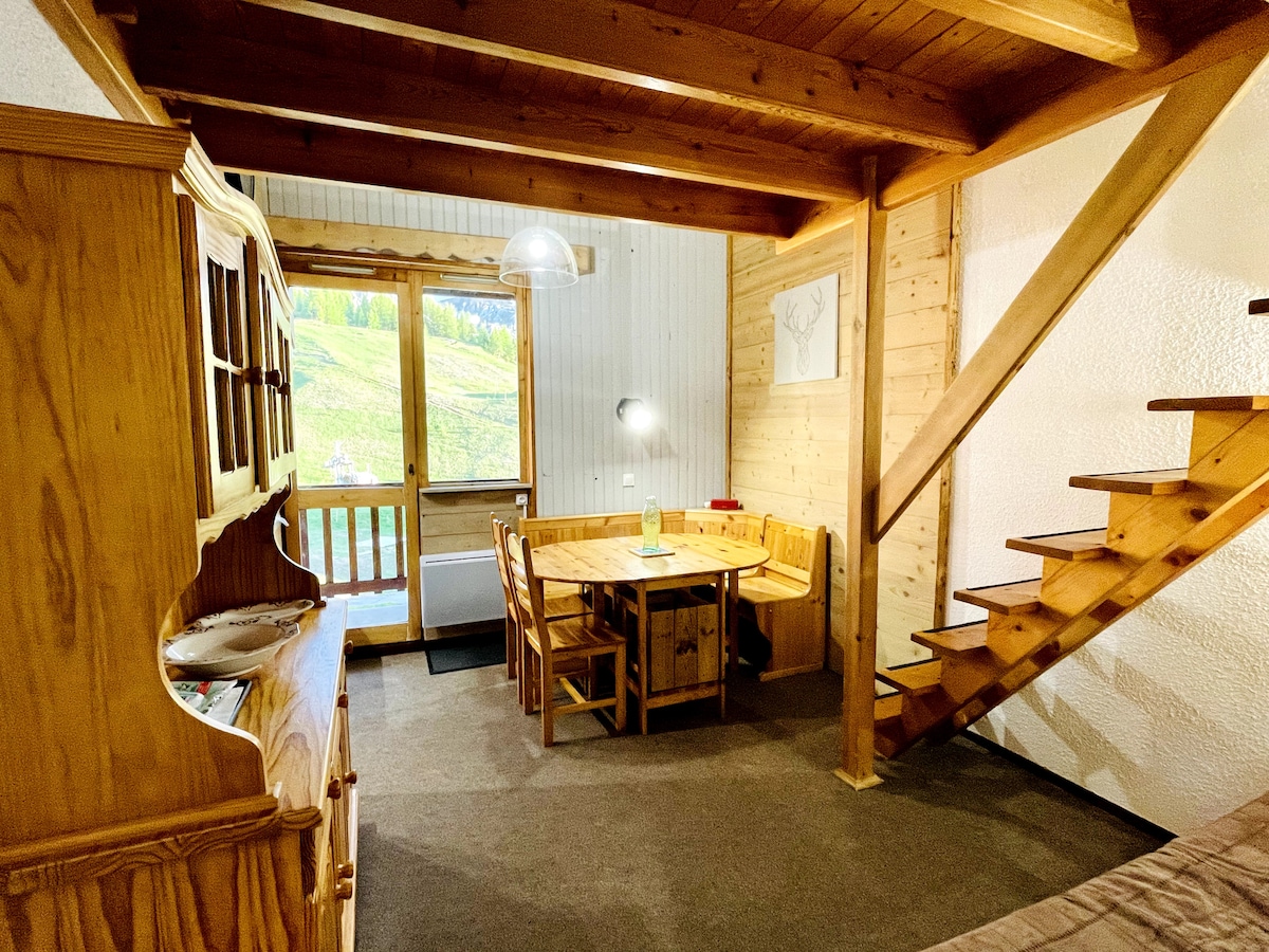 Apartamento dúplex reformado en noviembre de 2024. Salida y regreso con los esquís puestos Orientación y balcón orientados al sur, al pie de las pistas y pistas de esquí, en el centro de la zona. Planta baja: entrada, baño, sala de estar, cocina (horno y microondas, nevera, lavavajillas, cafetera Nespresso, aparato de raclette, fondue), balcón Altillo: 4 camas 90 x 190 Aparcamiento gratuito, armario para esquís. Tiendas (supermercado, 3 restaurantes, esquí, forfait) al pie del edificio Residencia Les Hameaux 2