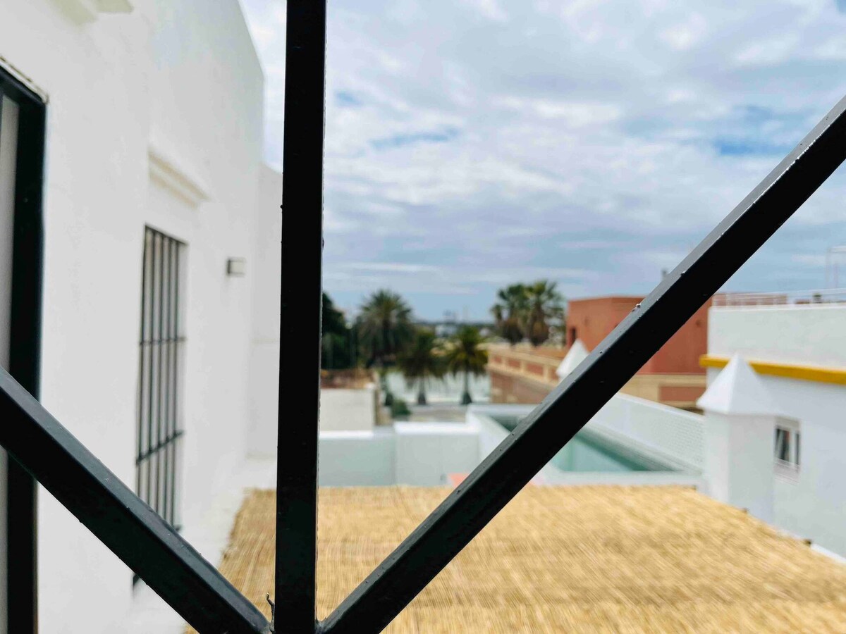 Precioso y coqueto apartamento de un dormitorio con una inmensa terraza (40m2) de acceso independiente y completamente equipada que mira al Castillo de San Marcos. La casa se encuentra en pleno centro de El Puerto de Santa María, a 2 minutos de bares y restaurantes y a 5 de la estación marítima que conecta con Cádiz. Es una zona muy tranquila, por lo que no tendrás molestias durante tu estancia, a pesar de estar muy cerca de todos los lugares de interés. El apartamento es ideal para parejas.