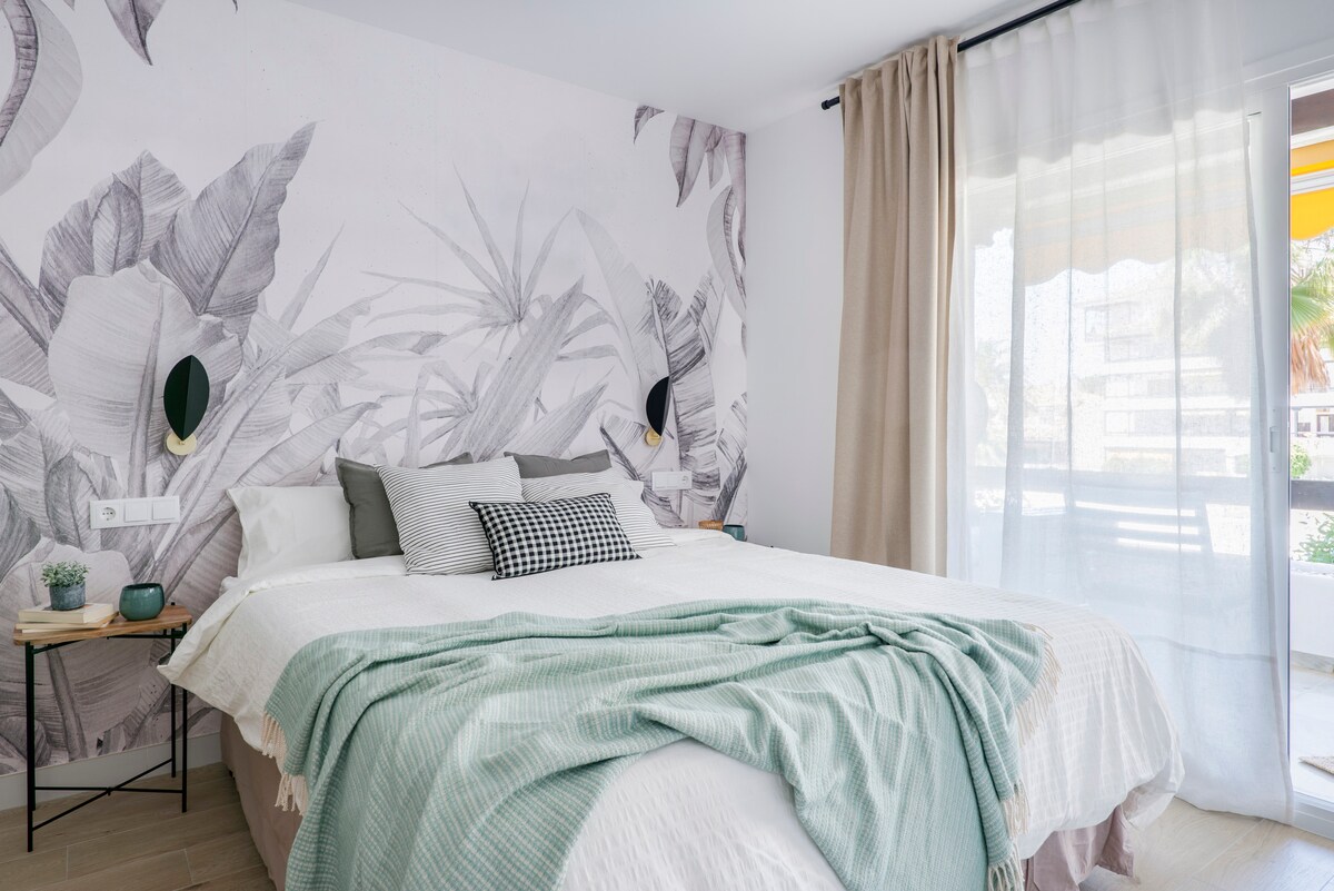Suite de diseño en la Milla de Oro, a un paso del Marbella Club. Disfruta de tu Nespresso en la terraza con impresionantes vistas al mar, a solo 4 minutos a pie de la playa. ✦ Terraza con vistas al mar y montaña ✦ 2 piscinas estilo resort + Pista de tenis ✦ Parking privado gratis* + Seguridad nocturna ✦ Wifi Fibra 1 Gbps + Smart TV / Netflix ✦ Cama Queen + Aire Acondicionado. Ideal para parejas, profesionales en remoto y familias pequeñas que buscan estilo, tranquilidad y la mejor ubicación.
