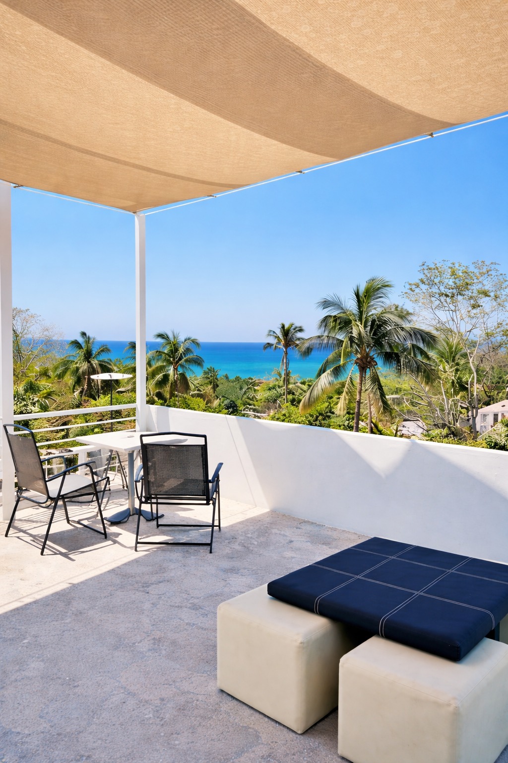 Apartamento luminoso de dos niveles con vista al mar y dos terrazas privadas ideales para el café de la mañana o para descansar al atardecer. El nivel inferior cuenta con un dormitorio estilo loft conectado a la cocina y el baño, mientras que el nivel superior ofrece una habitación totalmente privada con una cama tamaño king y un sofá cama. Con aire acondicionado, internet de Starlink, un pequeño espacio de trabajo y acceso a las escaleras, es un refugio relajante y cómodo en Puerto Escondido.