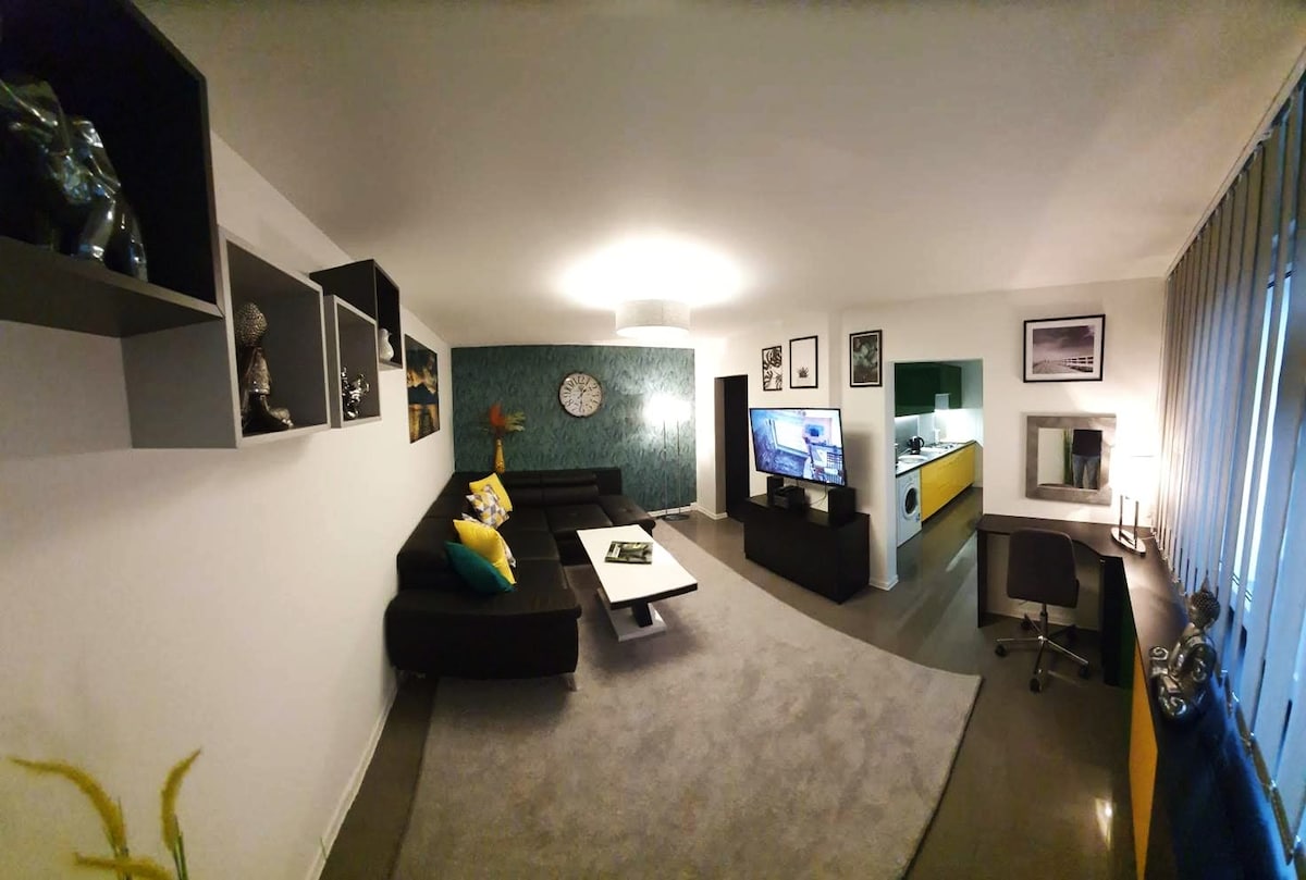 El lugar es cómodo y moderno. El apartamento tiene un dormitorio separado con armario y una sala de estar con TV y mesa con 4 sillas. El sofá es plegable y sirve como cama supletoria. La cómoda mesa y las sillas pueden servir como comedor o lugar de trabajo. La cocina tiene lavavajillas, nevera, cocina de gas y hervidor eléctrico. El baño está equipado con una bañera que se puede utilizar como ducha. Perfecto para familias y viajes de negocios. El apartamento tiene lavadora y aspiradora.