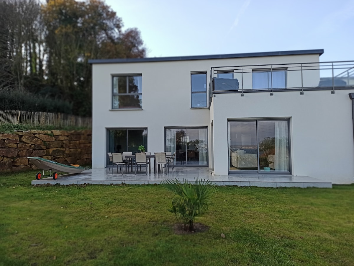 Chalet completamente nuevo, con magníficas vistas al mar. Déjese tentar por un formidable crepúsculo matutino donde el sol parece esconderse tímidamente detrás de la península de Crozon. Hermosas playas y senderos costeros notables cerca, que te llevarán rápidamente al fuerte de Berthaume, un monumento imprescindible de Plougonvelin. También podrá relajarse en una terraza que le permitirá disfrutar de un paisaje suntuoso, así como acceso a un jardín privado.