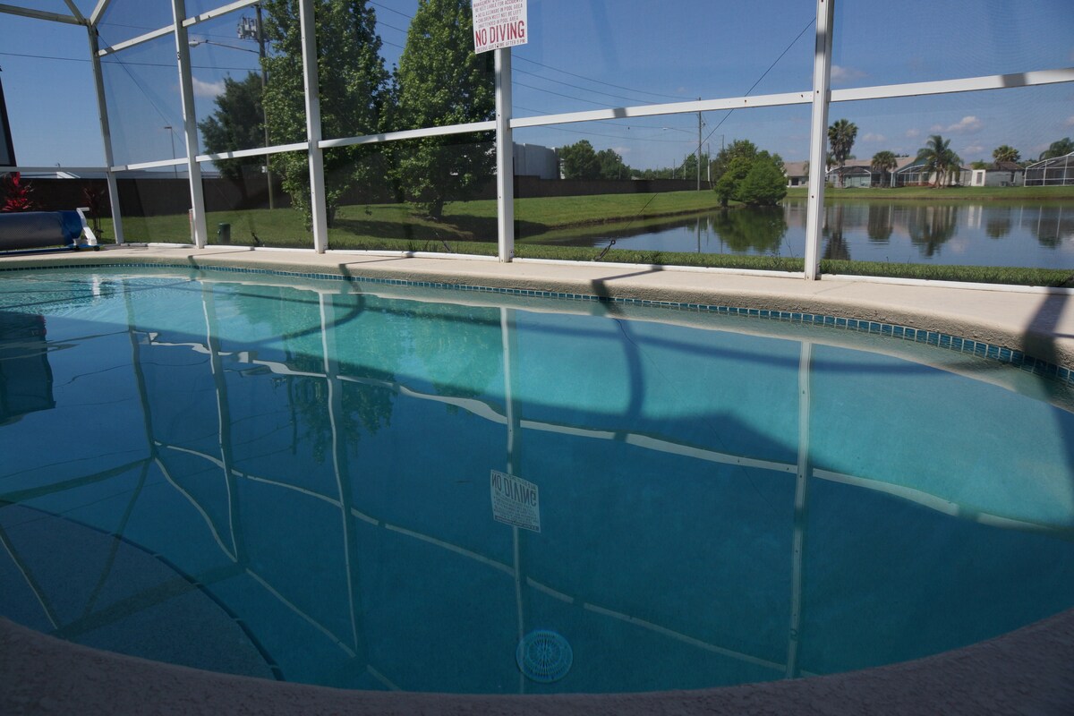 Sit back and relax in this stylish home with all the amenities you need for a fun family getaway. This home has a spacious layout with 3 bedrooms and 2 baths. We have thought of everything so you don't have to-toiletries,washer/dryer, and wifi. Enjoy your morning coffee in the screened in pool area with a beautiful sunrise and lake view or sip a glass of wine while floating in the pool. Just minutes to Theme Parks and major highways, this is the dream home you have been waiting for!