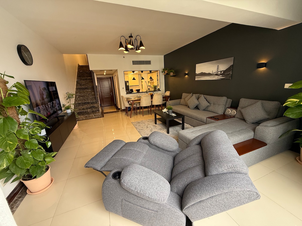 Relájate y disfruta de tu estancia en este acogedor apartamento de dos dormitorios en el Nuevo Cairo, a pocos minutos de la Universidad Americana de El Cairo. El departamento cuenta con un jardín privado, perfecto para relajarse o disfrutar de tu café de la mañana. Todos los servicios se encuentran dentro del complejo, incluidos cafés, restaurantes y áreas comerciales. Totalmente amueblado con wifi, dos televisores inteligentes, aire acondicionado en todas las habitaciones y en la sala de estar, registro de entrada automático y estacionamiento gratuito. Ideal para familias, parejas y viajeros de negocios.