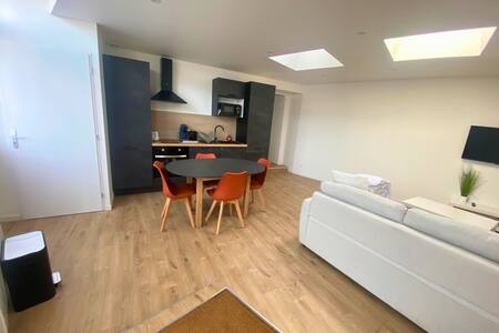 Venga a descansar fresco en el campo en un entorno tranquilo para disfrutar de la naturaleza. El apartamento tiene 40 m². Una gran habitación de 30 m² con zona de dormitorio, zona de estar y cocina americana. Cuarto de baño con ducha e inodoro. Entrada independiente y aparcamiento fácil y gratuito delante de nuestra casa. No puedo registrar la dirección en el sitio, así que aquí está: 15 allée des Camélias a las de Belle frente al consultorio veterinario, no muy lejos de la iglesia
