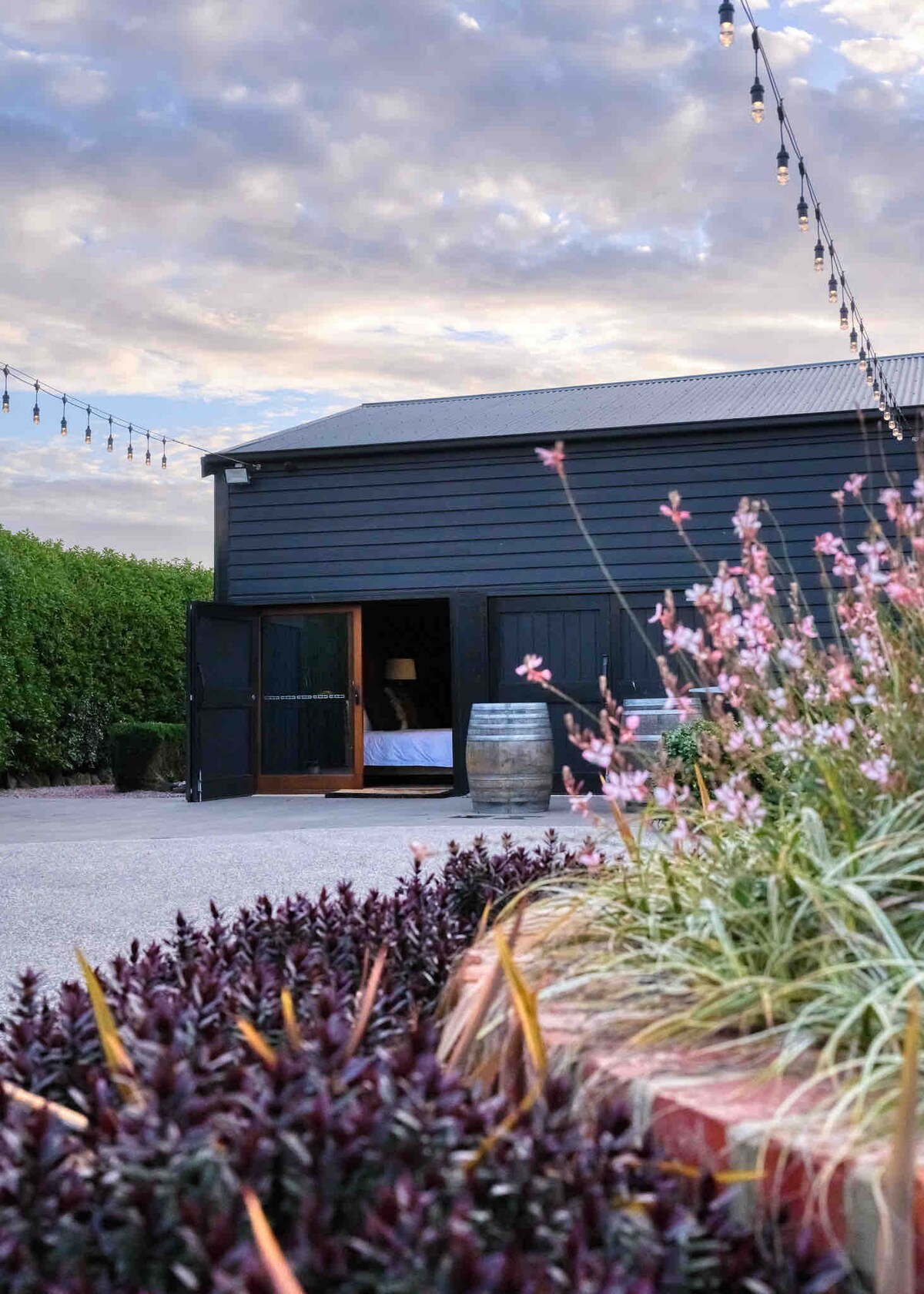 The Landing — a stunning couples getaway. Your perfect retreat, in a quiet corner and still close to the Centre of Warrnambool, complete with tranquil views, a fire-pit, baths and a cinema. Book yourself in this ultimate escape. Inside, it is thoughtfully designed with a king bed, an oversized bath, a double shower and more. With over 200 five-star reviews, this thoughtfully crafted stay is the ultimate setting for your unforgettable experience-based getaway.