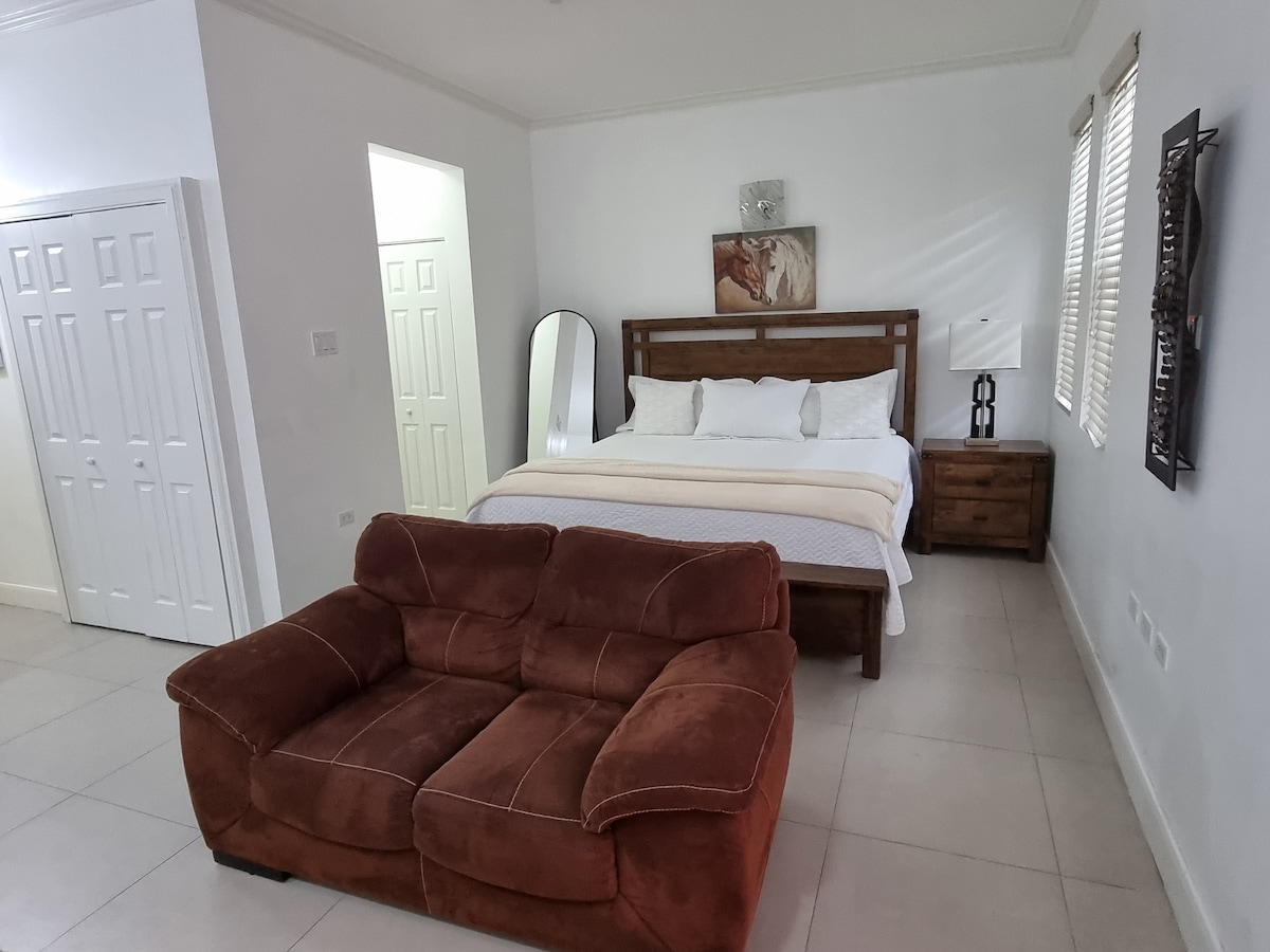 Relájate en la ciudad soleada de la ciudad metropolitana de la calle Catherine, a unos 40 minutos en coche del aeropuerto internacional Norman Manley. Hay un dormitorio con una cama tamaño king, una unidad de aire acondicionado, televisión, también hay un baño, una sala de estar y un comedor, una cocina varandah y un mini gimnasio. También ofrecemos WiFi gratuito y espacio en el parque y rodeada de áreas recreativas como restaurantes, supermercados, clubes, gasolineras y playas a unos 7 a 8 minutos de la propiedad, es muy relajante.