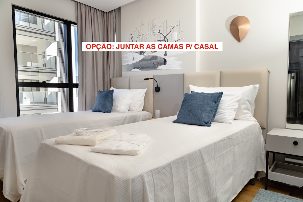 Flat em hotel 5 estrelas ⭐⭐⭐⭐⭐ O apto ocupa espaço no mesmo edifício de um hotel, porém, não temos serviços de hotelaria como troca de roupa de cama ou toalhas. Toda a área de lazer PODE SER USUFRUÍDA pelos hóspedes (como academia, spa, restaurantes, piscina) - 1 quarto de casal (roupa de cama e banho inclusas) - 1 vaga de garagem para carros grandes - 1 Banheiro c/ secador de cabelo - Sala c/ sofá-cama, TV e mesa para 4 pessoas - Cozinha completa - Café da manhã no hotel disponível à parte