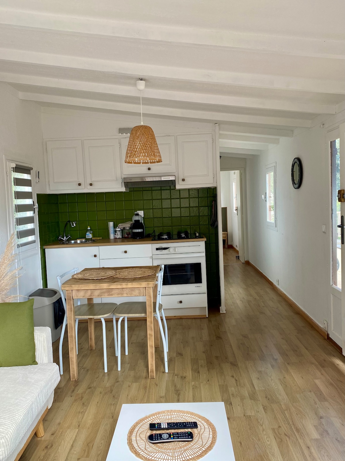 Chalet nuevo de 43 m² situado en una parcela privada bordeada de maquis, a 2 km del mar Una habitación con cama de matrimonio (160), baño, sala principal con todas las comodidades con zona de cocina y pequeño sofá cama para dormir infantil Equipamientos interiores: aire acondicionado reversible, TV, horno, microondas, placas de inducción, lavadora Instalaciones exteriores: terraza con sombrilla, zona de sillas mesa de centro, zona de plancha-grill Alojamiento ideal para parejas o amigos con niños