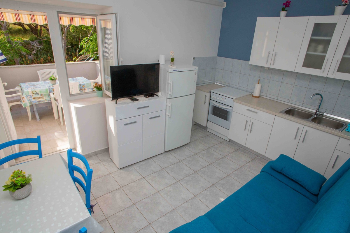 Villa tranquila y tranquila con mucho verde en el patio grande y la playa de características privadas. Solo tres apartamentos en esta villa garantizan una estancia agradable sin las multitudes. Los apartamentos son espaciosos, con grandes terrazas con vistas al mar y están totalmente equipados con todos los muebles, electrodomésticos y aire acondicionado. Se accede a la playa por varios pasos desde el patio. Tiene una parte de arena apta para niños pequeños, sombra, pero un muelle de hormigón y acceso en barco.