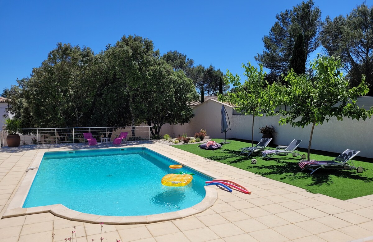 Casa de 100m2 con dos habitaciones para adultos, una habitación infantil, un escritorio con futbolín, bonita cocina equipada, terraza con plancha, aire acondicionado en todas las habitaciones, estacionamiento privado, jardín con piscina, mesa de ping ping ping-pong, cabaña para niños y cama elástica a 10 minutos de Nimes. Tenemos una gata pequeña, Xilia, muy cariñosa gracias por darle algunas croquetas y algunas caricias.