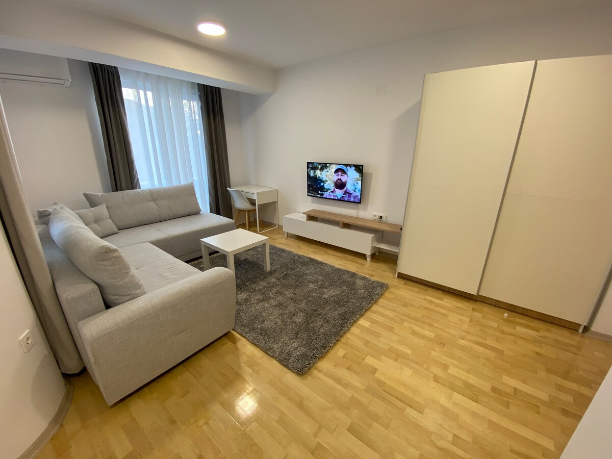 Apartamento de lujo Struga - Edificio 4 ¡Bienvenido a mi acogedor y moderno apartamento a solo 3 minutos a pie del lago Ohrid! El apartamento tiene capacidad para tres personas cómodamente, con un dormitorio con una cama doble grande y una acogedora zona común que puede alojar a una persona adicional en el sofá grande. ¡Tendrás acceso completo a una sala de estar luminosa y espaciosa con una televisión inteligente, una cocina totalmente equipada para todas tus necesidades de cocina, wifi rápido, aire acondicionado y un baño limpio y moderno!