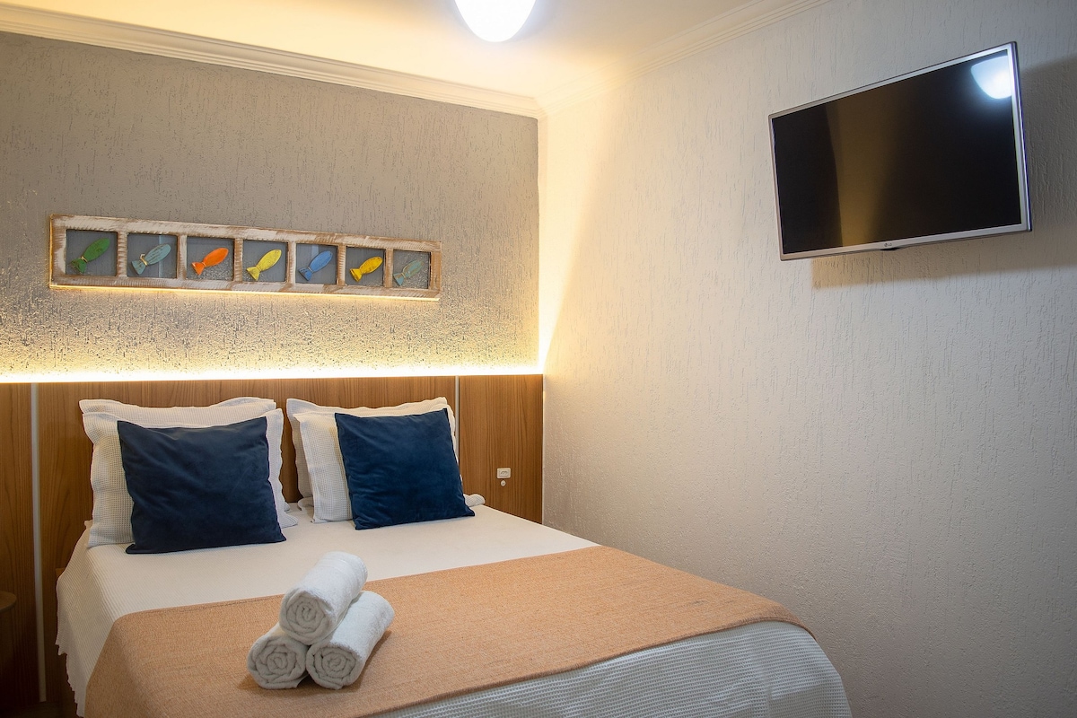 Ubicado en la avenida principal de la ciudad, a 300 metros de Porto da Barra con todo tipo de comercio en el condominio (Supermercado, Pizzería, Farmacia, Panadería, Salón de Belleza). Smart TV en salón y dormitorio con acceso gratuito a los principales servicios de streaming (Netflix, Amazon Prime, Globoplay, Youtube). Equipado con ropa de cama, mesa, utensilios de baño y cocina. Salón, dormitorio (una cama doble y dos individuales), cocina y balcón con barbacoa y ducha.