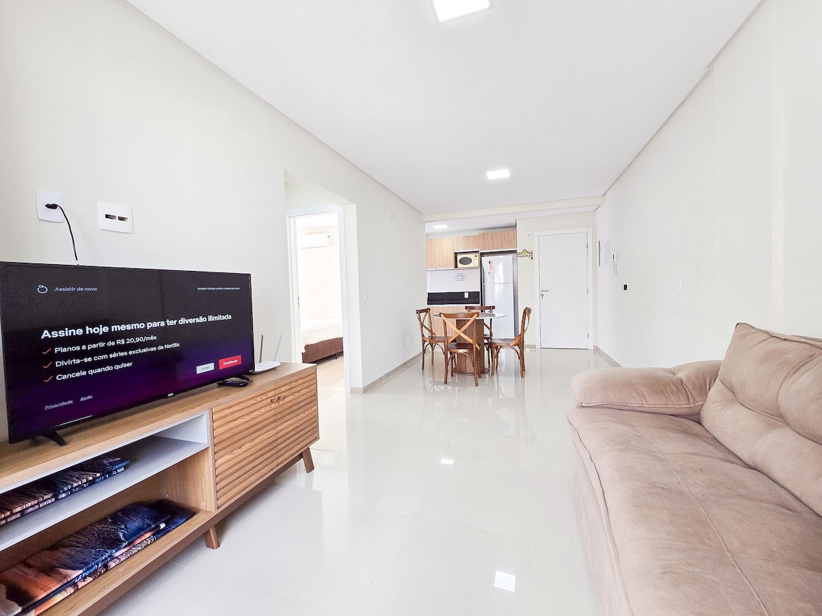 Apartamento nuevo, con piscina colectiva y ascensor, ubicación privilegiada, cerca de supermercados, restaurantes y tiendas. Con una habitación doble en suite, 1 dormitorio con 2 camas individuales y 2 colchones adicionales, ambos con aire acondicionado dividido, sala de estar, TV inteligente y comedor Wi-Fi, balcón con barbacoa, cocina con nevera dúplex, microondas, cafetera eléctrica, sándwichera, licuadora y otros utensilios, área de servicio con lavadora y estacionamiento para un auto.