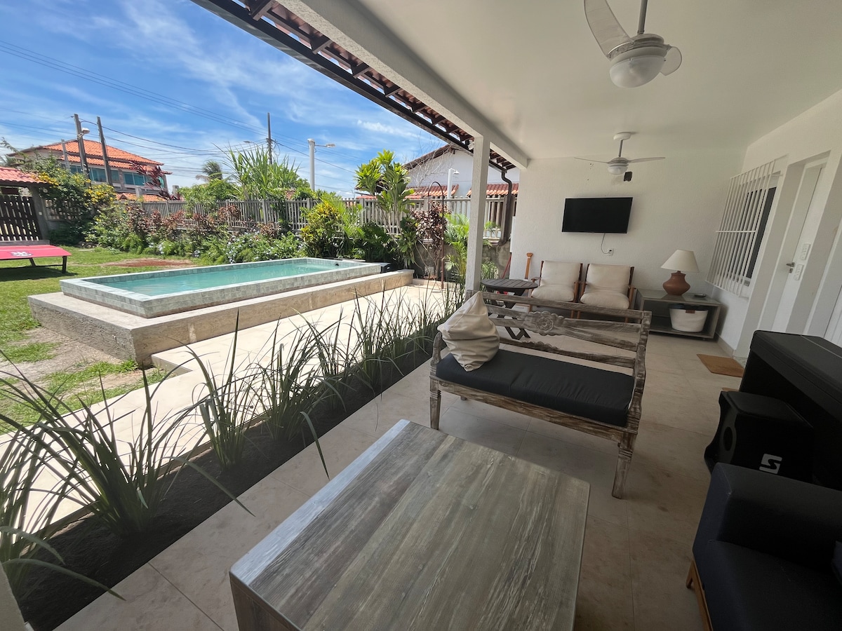 Hermosa casa en una calle tranquila, con dos dormitorios, uno de ellos en suite, ambos con aire acondicionado, muy bien equipada, con sala de estar y cocina americana equipada, baño social y otro en la zona de ocio, con parrilla, piscina con una hermosa terraza y con plaza de garaje para 4 vehículos a 100 metros de la mejor playa de Itaúna en Saquarema. Internet con velocidad de 240mb