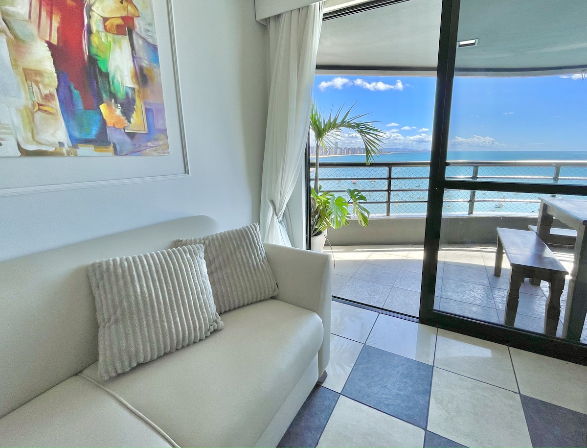 * NO TENEMOS ANUNCIO EN BOOKING * ¡Ubicado en el paseo marítimo, el mayor punto turístico de la ciudad! Con restaurante, panadería y mercado en el propio condominio, está cerca de bancos, restaurantes, farmacias, y también a 01 cuadra de la famosa feria de artesanías del paseo marítimo. Son 83 metros cuadrados privados, con vista frontal y total al mar de la suite y la sala, cocina completa, sala de estar con sofá cama, dos dormitorios (1 suite), dos baños completos, ¡en la zona más valorada de Fortaleza!