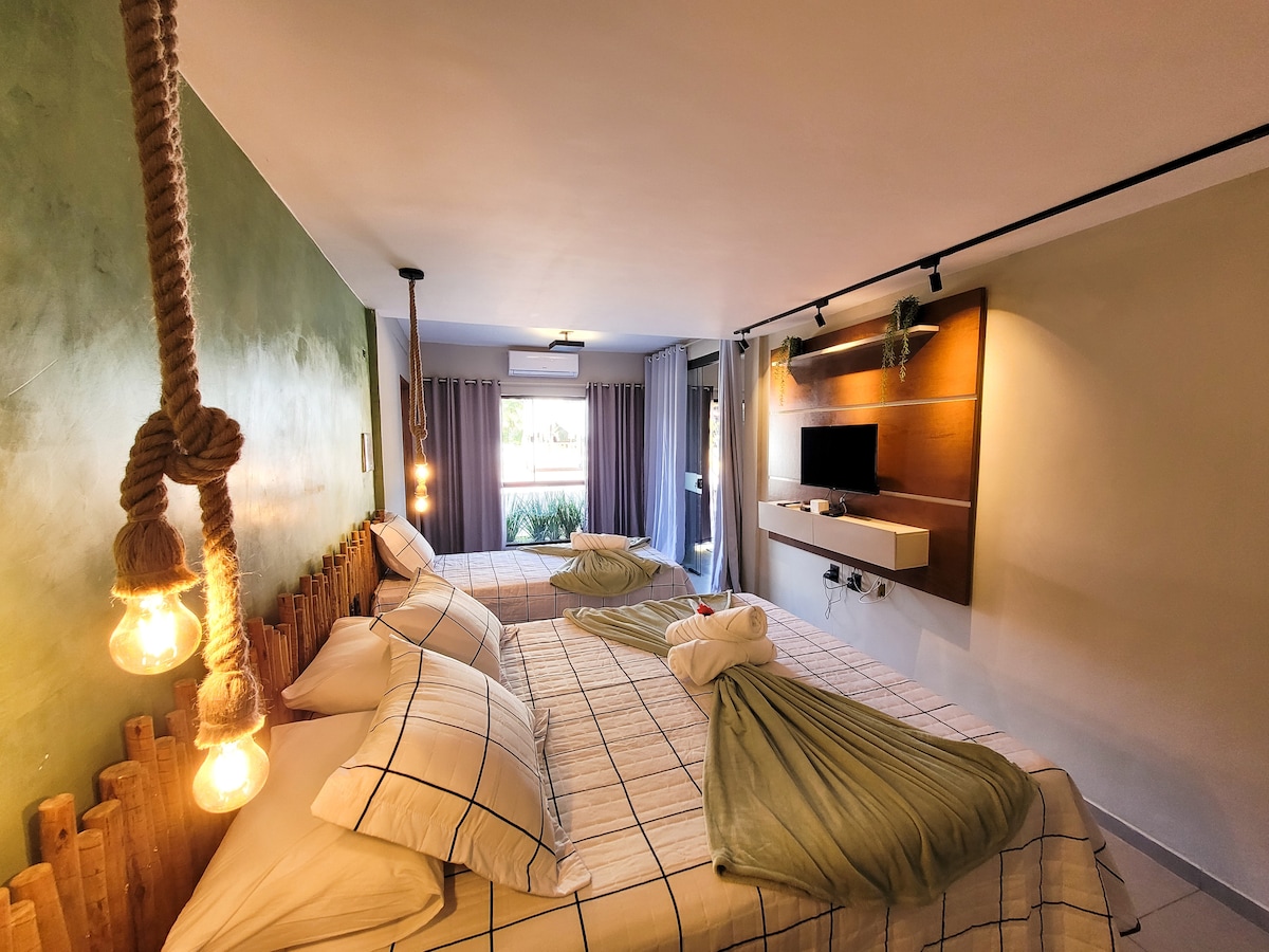 A acomodação trata-se de apartamento estilo loft, com duas camas de solteiro mais outro quarto amplo de casal super quing 2,5, roupeiro, cofre ..cozinha conjugada com a sala e varanda com mesa de jantar para 4 pessoas. Com air split em ambos cômodos . Localizado dentro de um maravilhoso condomínio residencial de luxo, considerado a mais lindo da Costa do Descobrimento, totalmente imerso na natureza tropical .Dessa forma podemos acordar com os cantos dos pássaros, o sossego e tranquilidad