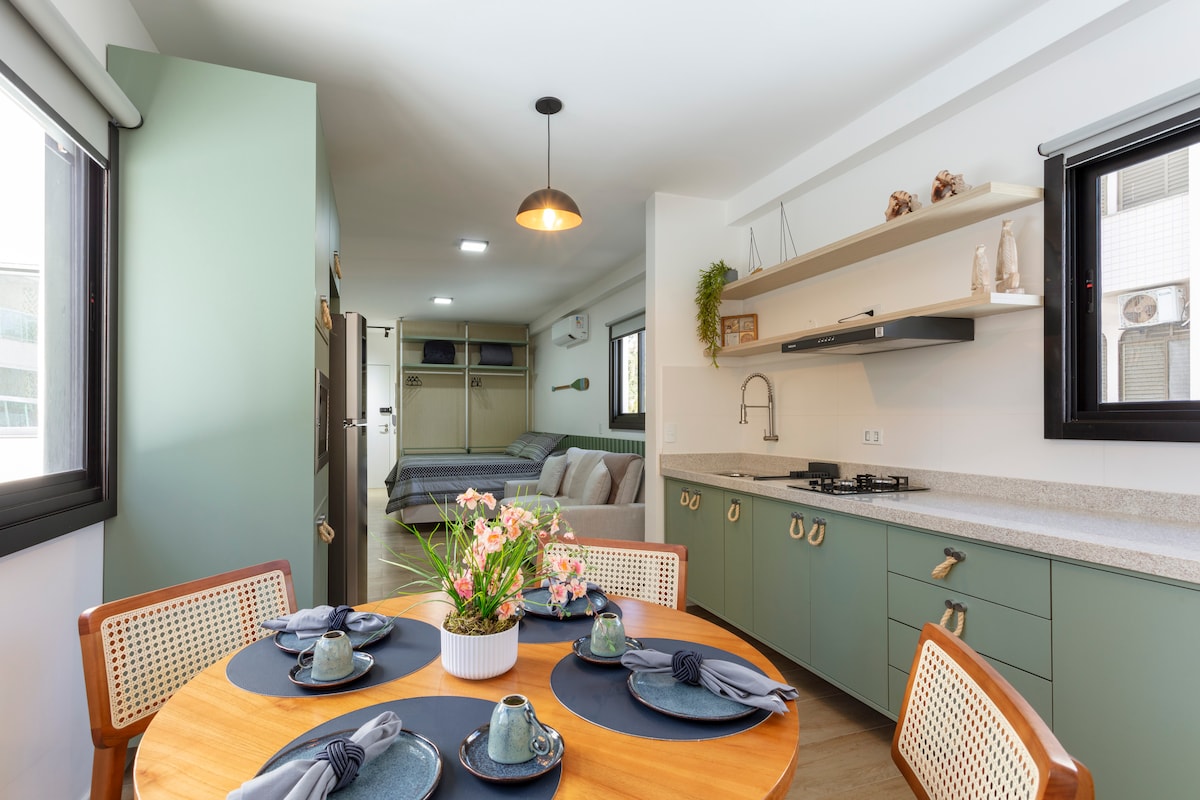 Espaço completo para 01 casal, área útil 45m2 em propriedade com outras unidades. 01 vaga carro descoberta, portão automático. Cama Queen, Ar 12000 BTU, ventilador, smart TV 50", cozinha exclusiva com microondas, frigobar, fogão 02 bocas sem forno, liquidificador, sanduicheira, cafeteira, filtro de barro. Terraço com churrasqueira, Internet claro fibra, piscina compartilhada. Praia Vermelha Praia Vermelha 100m, Tenório 400m, Cedro 1 km. Muito verde, pássaros, som do mar e ar condicionado