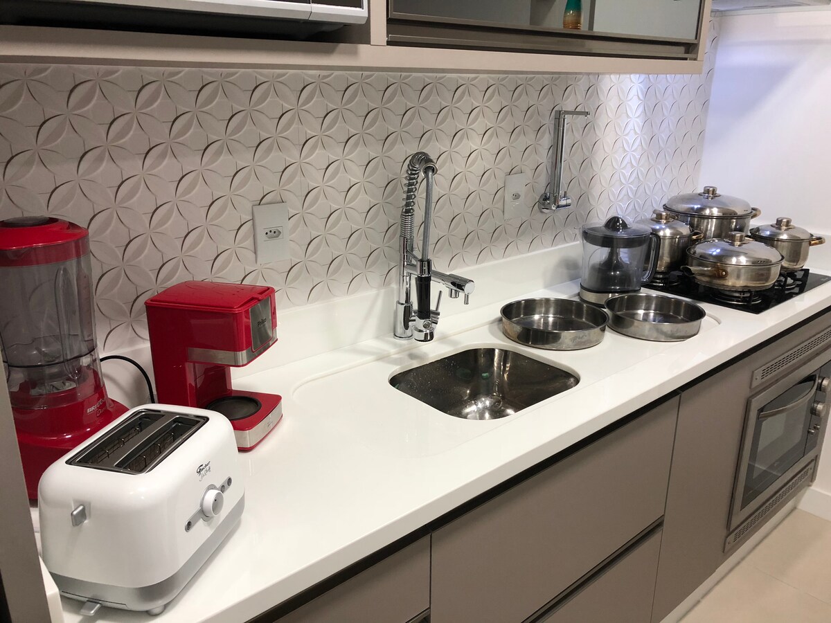 Precioso apartamento, amueblado, en el mejor condominio con piscina del sur del país - Marine Home Resort 1 dormitorio con suite con 1 cama doble y 1 cama individual, 1 baño, cocina, sala de estar, dos habitaciones, área de servicio, balcón con barbacoa. En la sala de estar hay 1 sofá cama súper cómodo y colchón inflable HABITACIONES CON AIRE ACONDICIONADO Wifi, televisor INTELIGENTE con NETFLIX en 2 TELEVISORES (IPTV) Cochera cubierta para 1 auto Condominio a 100m de la playa Cachoeira. Tiene un supermercado en la planta baja.