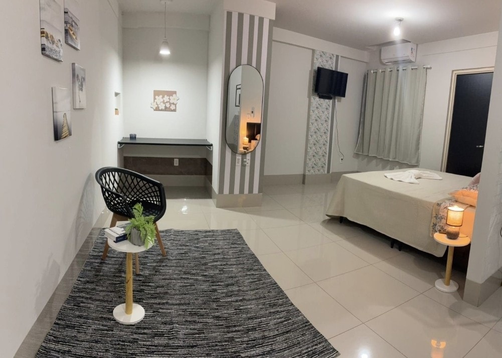 Espaco exclusivo para voce que esta de passagem em Primavera do leste e nao prentender gastar muito! Esse espaco oferece o melhor custo beneficio anunciado o espaco tem 1 quarto com banheiro, cama de casal ar condicionado, tv, wifi, roupeiro e mesa para trabalho. 1 cozinha com fogao, geladeira e o basico para tomar um cafe e realizar refeicoes rapidas e ainda conta com uma pequena area que tem um tanque para lavar roupas e uma maquina de lavar.