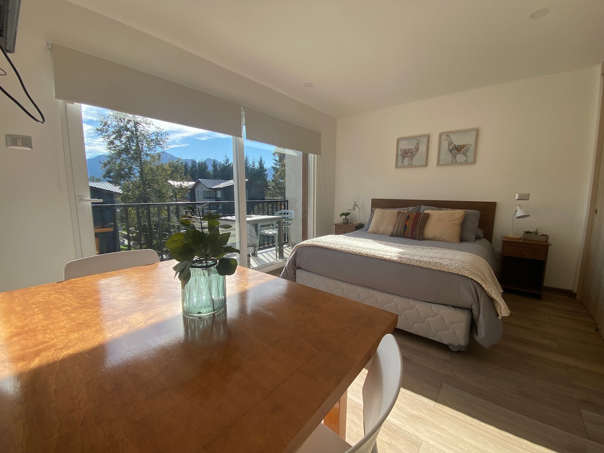 Nuevo y acogedor estudio en la mejor ubicación de Pucón, a pasos de playa grande, centro, y aislado del ruido de la calle principal. Cuenta con cama de 2 plazas, un futón de 2 plazas, cocina full equipada, baño completo, WiFi, TV 49" con Netflix, Disney+ y más, terraza, calefacción, parrilla, cafeteras, 2 bicicletas de uso ilimitado, entre otros. Estacionamiento público frente al acceso al edificio disponible. Incluye ropa de cama, toallas, e insumos básicos de baño y cocina para cada estadía.