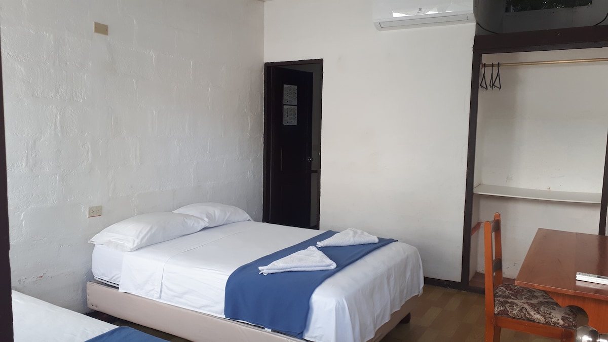 Habitación triple con baño privado, aire acondicionado, WiFi y TV. Ideal para familias o grupos pequeños que buscan comodidad y buen descanso tras un día de aventura en Galápagos. Cuenta con camas confortables, agua caliente y acceso a zona compartida con microondas y refrigeradora. Ubicada en una zona tranquila de Puerto Ayora, cerca de restaurantes, tiendas y puntos de salida para tours. Limpieza y atención personalizada garantizadas.