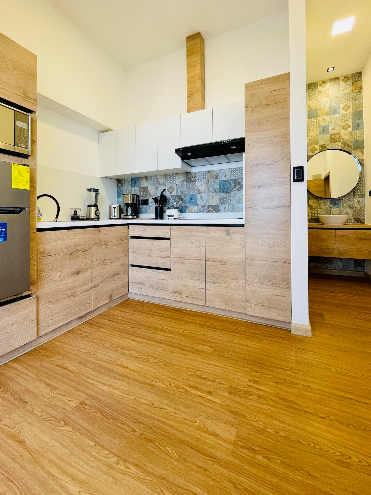 Absorba la relajante luz y calidez que penetra todo el espacioso ambiente a travez de las grandes ventanas y tragaluces. Relájate debajo de unos amplios cielos raso de 3 metros en las habitaciones y uno abovedado de 6 metros en la cocina abierta estilo americano. ⚡️ agua caliente, Wi-Fi y luz para tus dispositivos las 24/7 gracias al sistema de baterías de respaldo. Ojo: algunos electrodomésticos de alto consumo, cómo el secador de pelo y la tetera, no funcionan durante los cortes de energía.