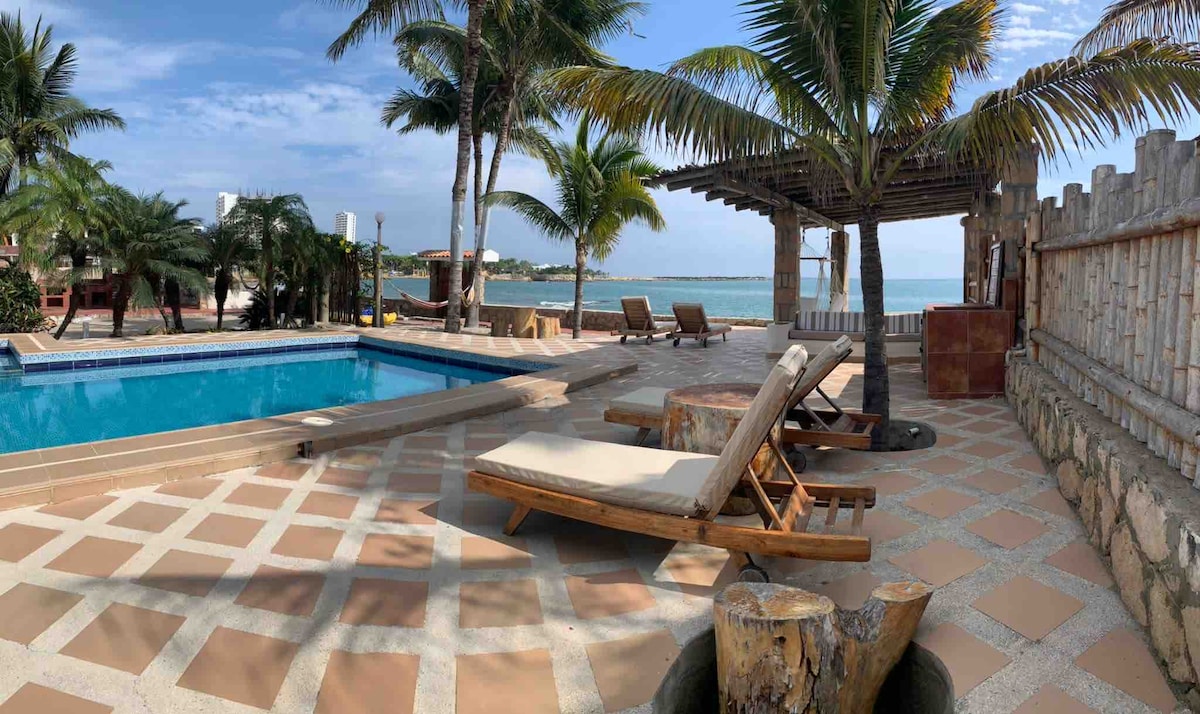 Frente al mar con seguridad 24h en la urbanización, playa y parqueo. Acorde con el sonido del mar, tome café con la brisa entrando por la ventana y sienta que el tiempo paró ♥ ⭐Incluye: • 3m caminando a playa • Parqueo y vistas 360° • WiFi 600Mb • Piscinas, jacuzzi y zona BBQ • Cuartos con A/C, agua caliente y cortinas • TV: Netflix, Spotify & Alexa • Airfryer, cafetera, micro, refri y cocina • 3 baños, cuna, Petfriendly, ascensor • Toallas, ropa de cama y papel • Guardias, y cámaras 24h