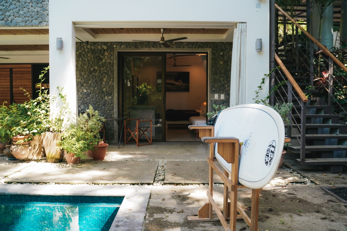 Casita de la Luna and its fraternal twin, Casita del Sol make up the first floor of a newly-built house on the ocean, at the mouth of Rio Nosara. Peaceful, quiet, a bit away from Guiones and Pelada, but close enough you can walk, drive or grab a tuktuk. Enjoy your own entrance and a beautiful shared beach-front salt-water pool overlooking the wilderness. Disconnect from the world in this perfect spot, where you can swim, explore tide pools, SUP on the river, or surf empty waves just steps away.