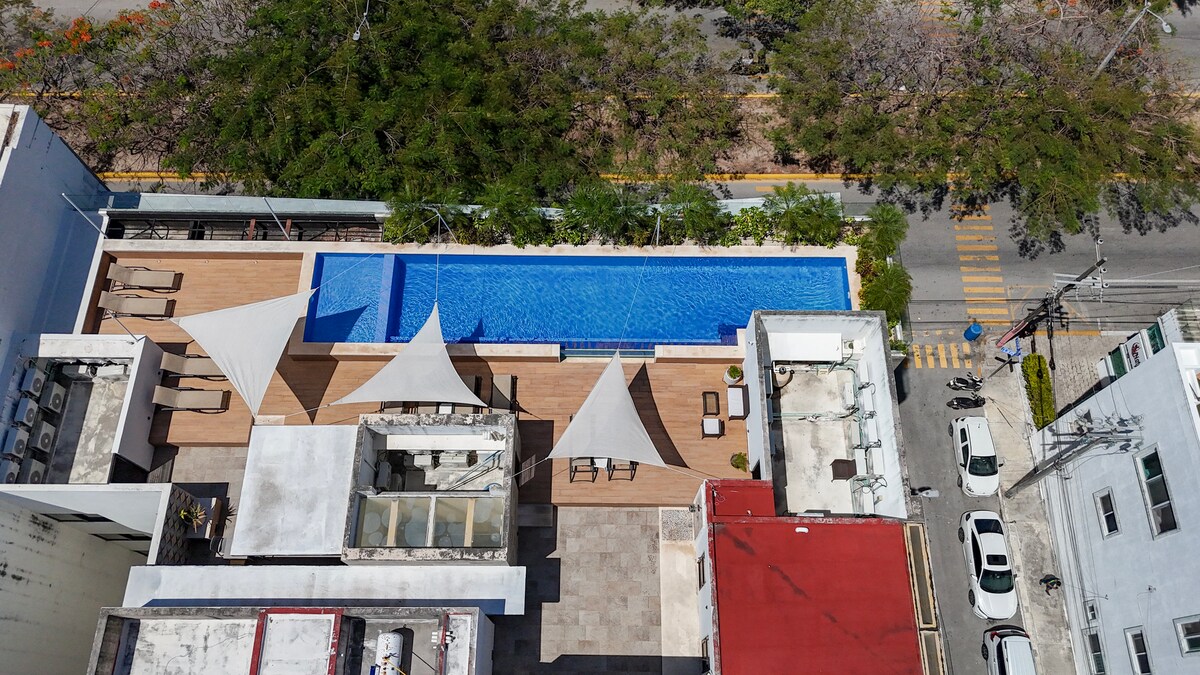 ¡Tendrás las mejores vistas de la ciudad! Disfruta de tu oasis privado con piscina en la azotea y vistas panorámicas de Playa del Carmen y el mar Caribe. Esta suite en el ático se encuentra a pocos pasos de playas, restaurantes y tiendas. Ubicado justo en la famosa Quinta Avenida, nuestro escondite, en StayCielo, está lo suficientemente cerca como para llegar a pie hasta la vida nocturna, pero lo suficientemente lejos del ruido como para disfrutar de una noche tranquila en casa también. A 5 minutos a pie de los clubes de playa Martina y Encanto, así como de excelentes opciones gastronómicas. ¡Envíame un mensaje para chatear!