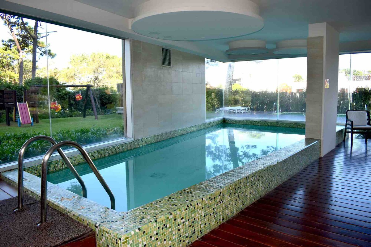 Piscina interior habilitada! Apartamento moderno, de lujo cómodo y completo, ideal para todo el año, a metros del Casino Conrad para disfrutar a pleno a 1 cuadra de la playa mansa. Con 2 dormitorios, 2 baños y toilette. Ventanales con vista al mar, terraza con jacuzzi propio. Este apartamento ofrece todos los servicios para que se sienta como en un hotel 5 estrellas (piscina climatizada, abierta, jacuzzi, sauna, gimnasio, canchas, playroom, barbacoa) servicio mucama y playa a diario.