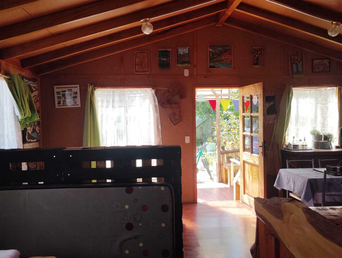 Cabaña de estilo abierto sin divisiones internas donde todos los espacios conviven en un mismo ambiente. La cocina, el living y el comedor se integran de forma armónica, creando un lugar amplio, fluido y funcional. Las camas se disponen dentro del mismo espacio, aprovechando la distribución para mantener una sensación de amplitud y calidez. Este tipo de cabaña destaca por su estilo libre y acogedor, ideal para compartir, descansar y vivir la experiencia de estar todo conectado en un solo entorno