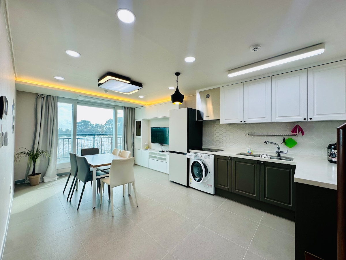 Oferta de apertura: Vista al mar en Seogwipo. Edificio nuevo. 2 habitaciones. Terraza. 4 baños. 2 camas king y 4 camas queen. Parrilla. Opciones completas. Para grupos. Viaje de golf. Festival de primavera
